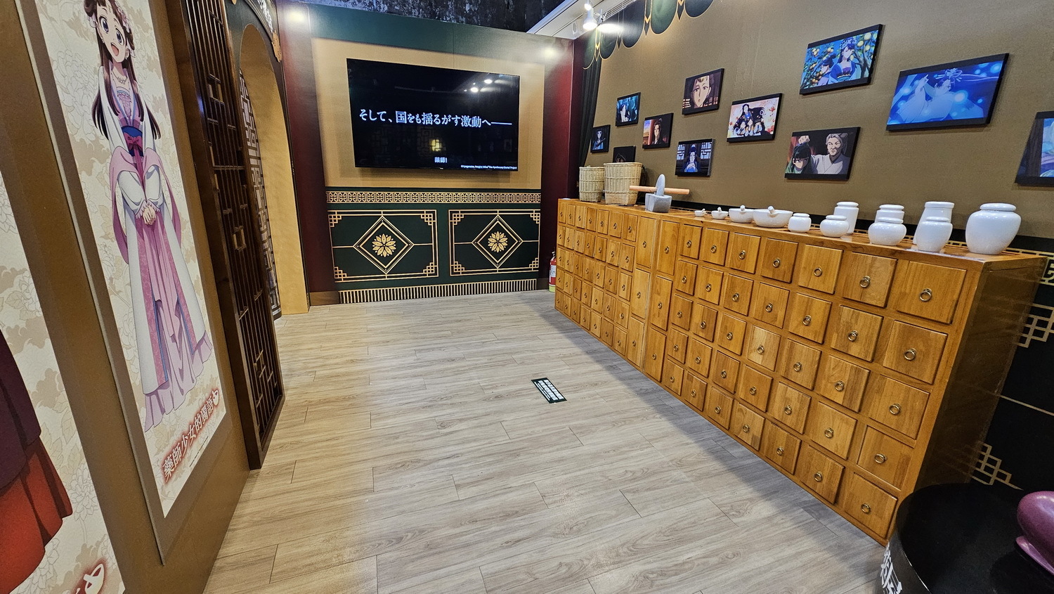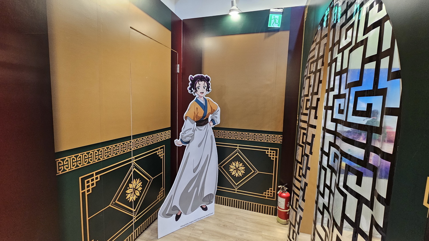 第一大任务“必拍名场景重现”,展区特别打造沉浸式宫廷拍照场景,从迎宾主视觉与壬氏、猫猫迎宾椅合影体验开始,接续走入经典回忆长廊回顾区,重现猫猫指认“这个有毒!”名场面、壬氏月下翩然起舞与两人一同坠入洞窟的戏剧性瞬间。角色卷轴宫廷场景墙则将猫猫、壬氏、高顺、小兰、楼兰妃、里树妃、梨花妃等主要角色卷轴一字排开呈现,宛如亲身步入宫廷深处。历季主视觉打卡墙更一次集结动画历代经典主视觉,让粉丝拍照搜集一气呵成。