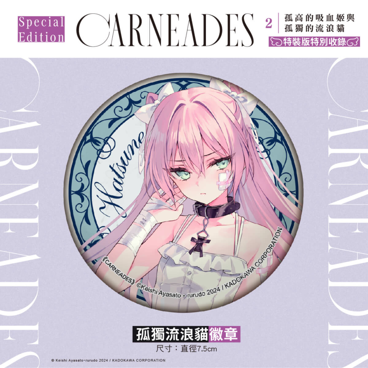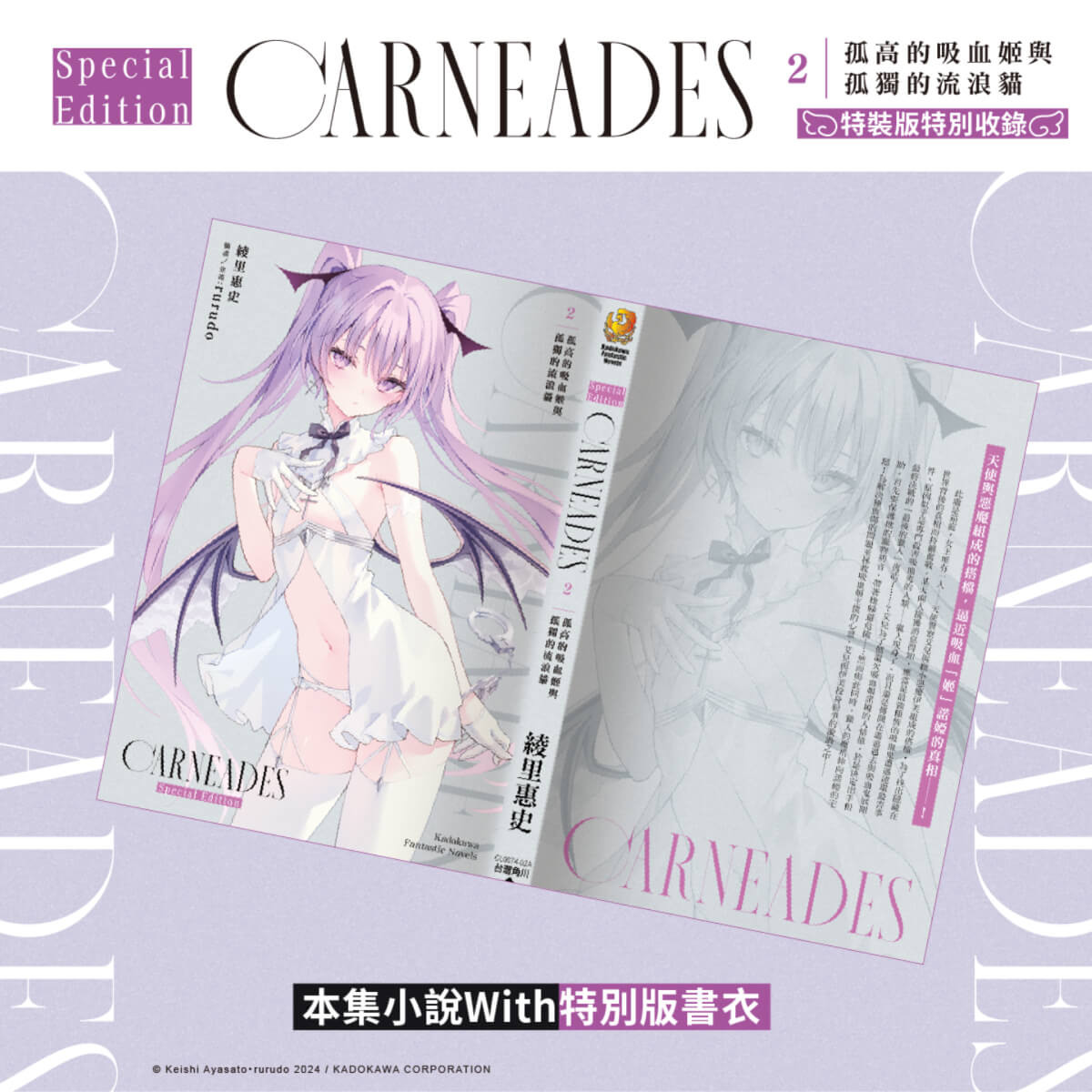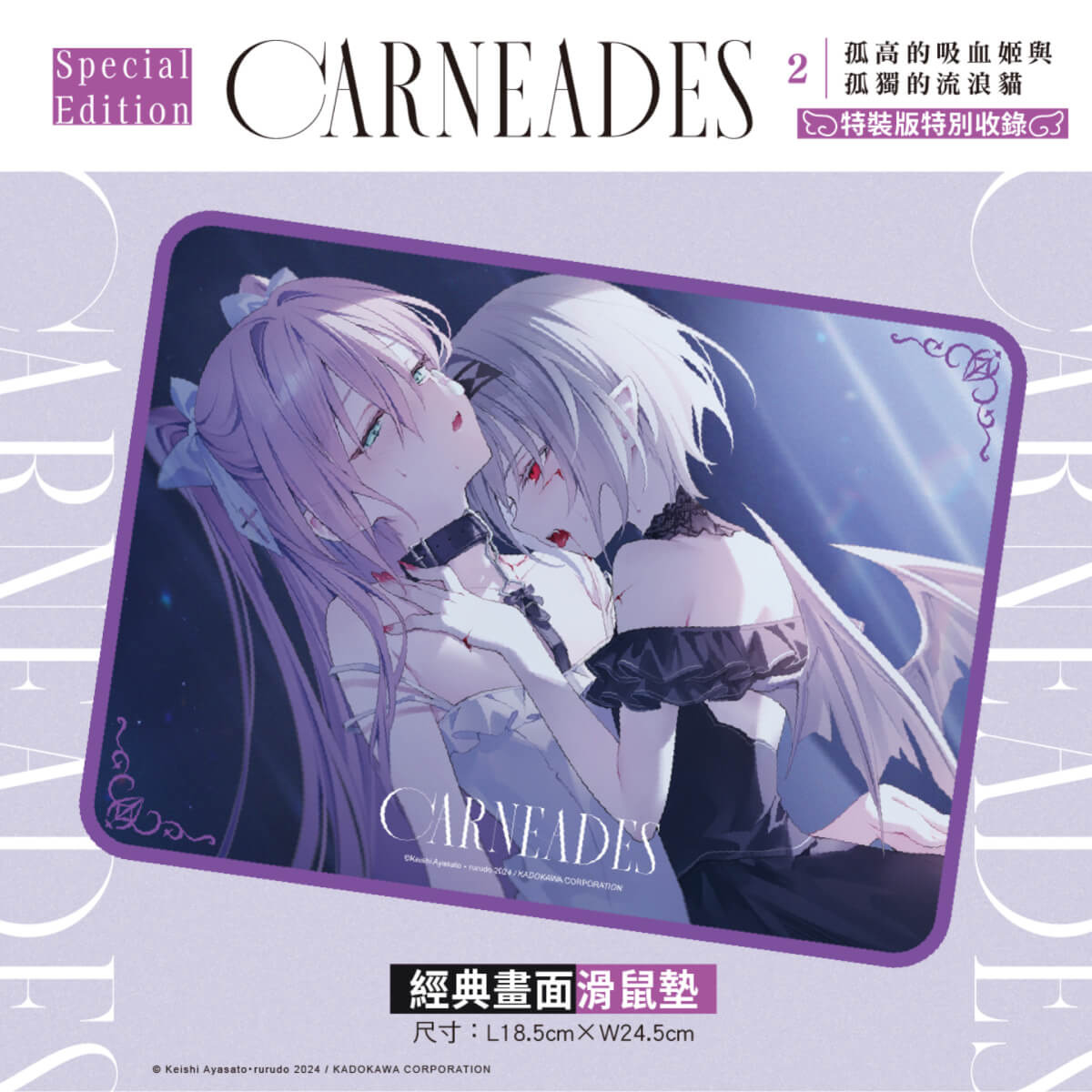 《CARNEADES (2) 孤高的吸血姬与孤独的流浪猫》特装版收录限定特典──以本集封面人物设计,唯美浪漫氛围的恶魔伊芙主题“组合压克力立牌”、高贵优雅的吸血姬诺娅与她美丽又神秘的宠物初音主题设计“经典画面滑鼠垫”还有“孤独流浪猫徽章”以及“本集小说 with 特别设计书衣”皆收录于“特装版珍藏书盒”,本次特装版自即日起开放全台指定通路事前预购至 1/27(二)。