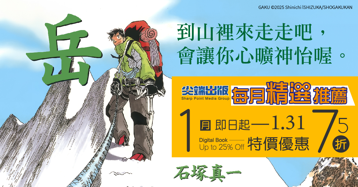 即日起至 1 月 31 日,尖端每月精选活动推出石冢真一老师的经典作品《岳》,限时 75 折优惠。本作曾改编为电影《岳:冰峰救援》,以登山者岛崎三步为主角,描绘他凭藉精湛的攀登技术,见证群山的壮丽与山难的残酷,在回到日本阿尔卑斯山后,持续以义工身分投入救助行动的故事。欢迎读者把握活动期间的优惠价格入手《岳》,一次收藏这部深刻动人的名作,为书柜增添一部值得反复阅读的作品!
