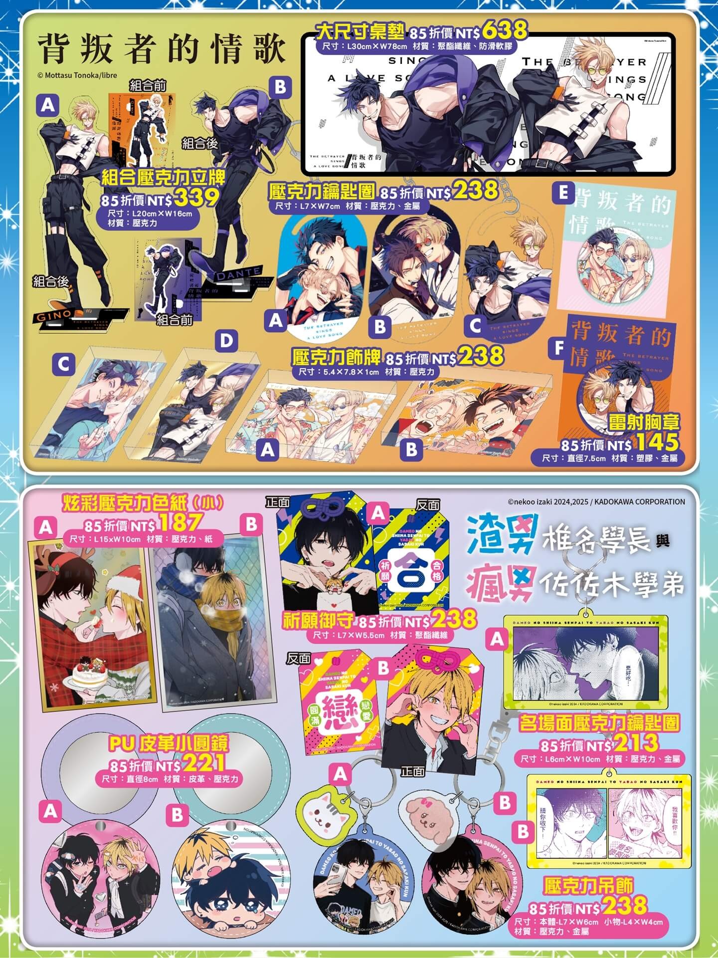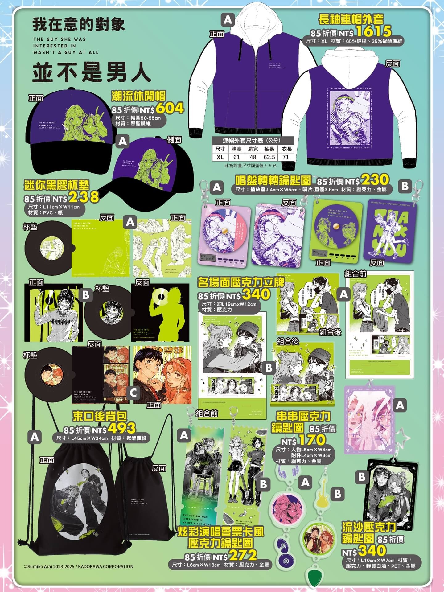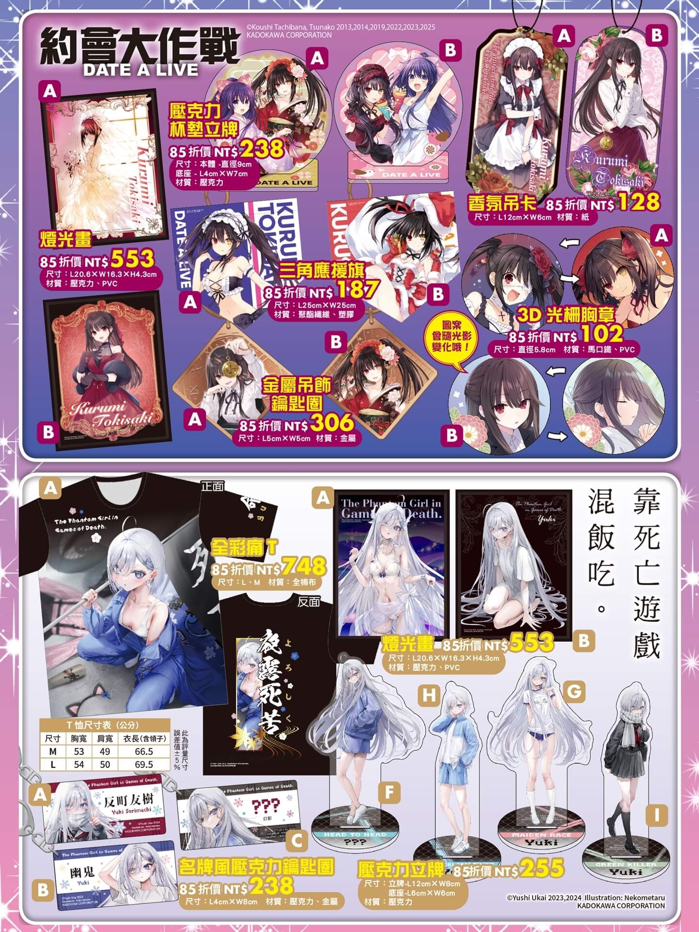 《不时轻声地以俄语遮羞的邻座艾莉同学》除有会场与官网预购限定的“复制原画(※ 含流水号)”与“大挂轴”,更首推兼具质感与实用的“磁吸金属手机支架”,搭配居家必备的“整片式门帘”、“金属旋转挂饰”与“眼罩”等,让艾莉全方位占据你的生活;《DATE A LIVE 约会大作战》推出随著视角变换展现立体美感的“3D 光栅胸章”,以及能散发迷人气息的“香氛吊卡”与妆点空间的“三角应援旗”等;《靠死亡游戏混饭吃。》大胆推出“全彩痛 T”让你把对角色的爱穿在身上,绝赞的“名牌风压克力钥匙圈”与“灯光画”等都值得入手;《我在意的对象并不是男人》结合摇滚音乐元素,带来设计感十足的“迷你黑胶杯垫”、“唱盘转转钥匙圈”、“串串压克力钥匙圈”以及“炫彩演唱会票卡风压克力钥匙圈”等,或是穿上“长袖连帽外套”并配上“潮流休闲帽”与“束口后背包”展现你的粉丝信仰;《全知读者视角》营造绝美氛围的“梦幻灯光画”不容错过,另也有办公通勤好帮手“压克力万年历”、“磁吸压克力便利夹”、“磁吸金属手机支架”与“伸缩证件卡套”;《背叛者的情歌》以大魄力的“大尺寸桌垫”霸气登场,加上精致的“压克力饰牌”与“雷射胸章”等;以及《渣男椎名学长与疯男佐佐木学弟》献上随身祈福的“祈愿御守”与质感满分的“PU皮革小圆镜”等,满足粉丝的收藏欲!会场首卖商品售完为止!