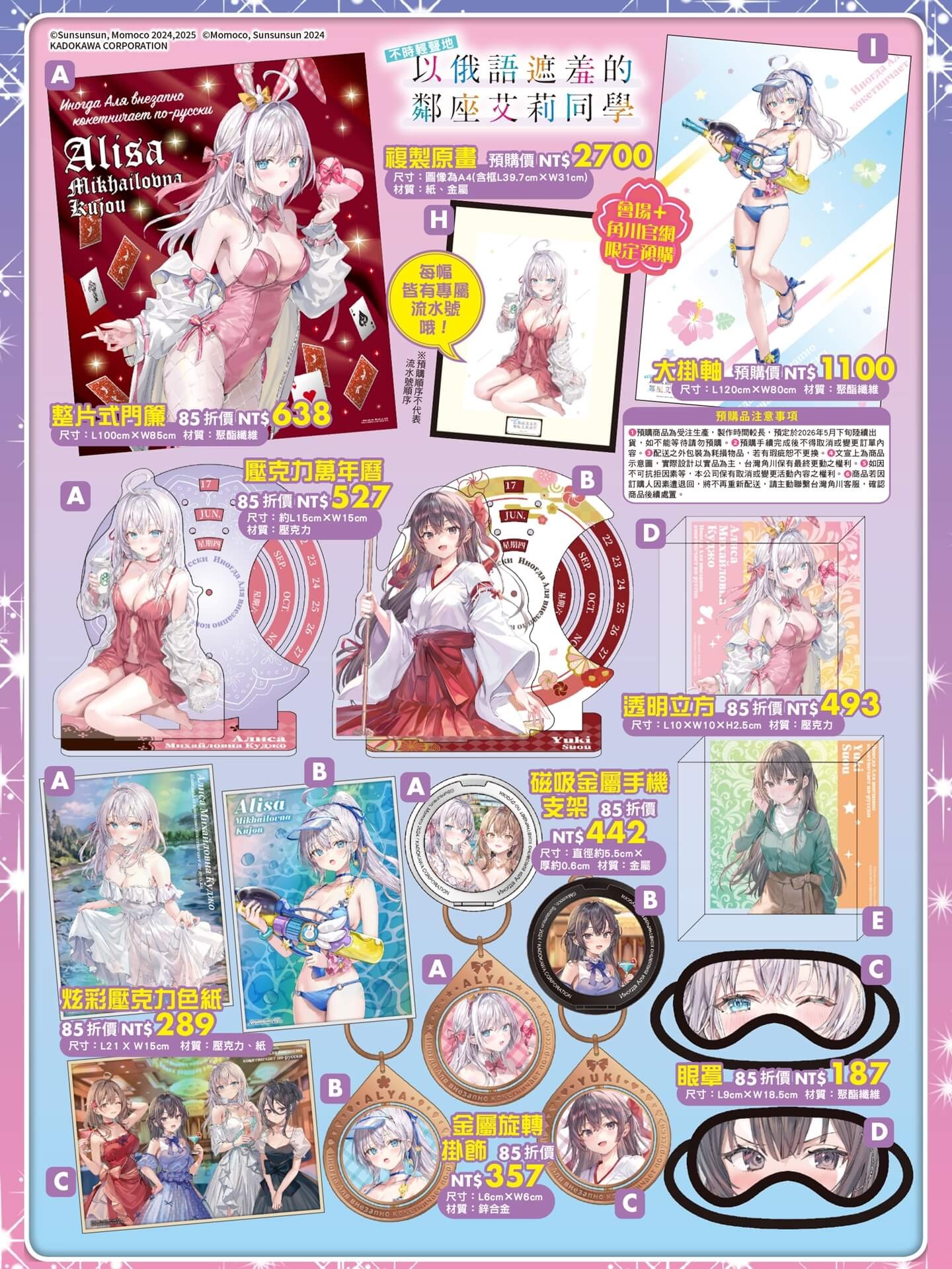 「2026 台北國際動漫節」將於 2/5 起在南港展覽館一館盛大舉辦,台灣角川今日公開近百款的動漫節首賣及會場限定的週邊商品資訊。 【以下內容為廠商提供資料原文】《不時輕聲地以俄語遮羞的鄰座艾莉同學》除有會場與官網預購限定的「複製... 最后编辑由 不存在的铃喵