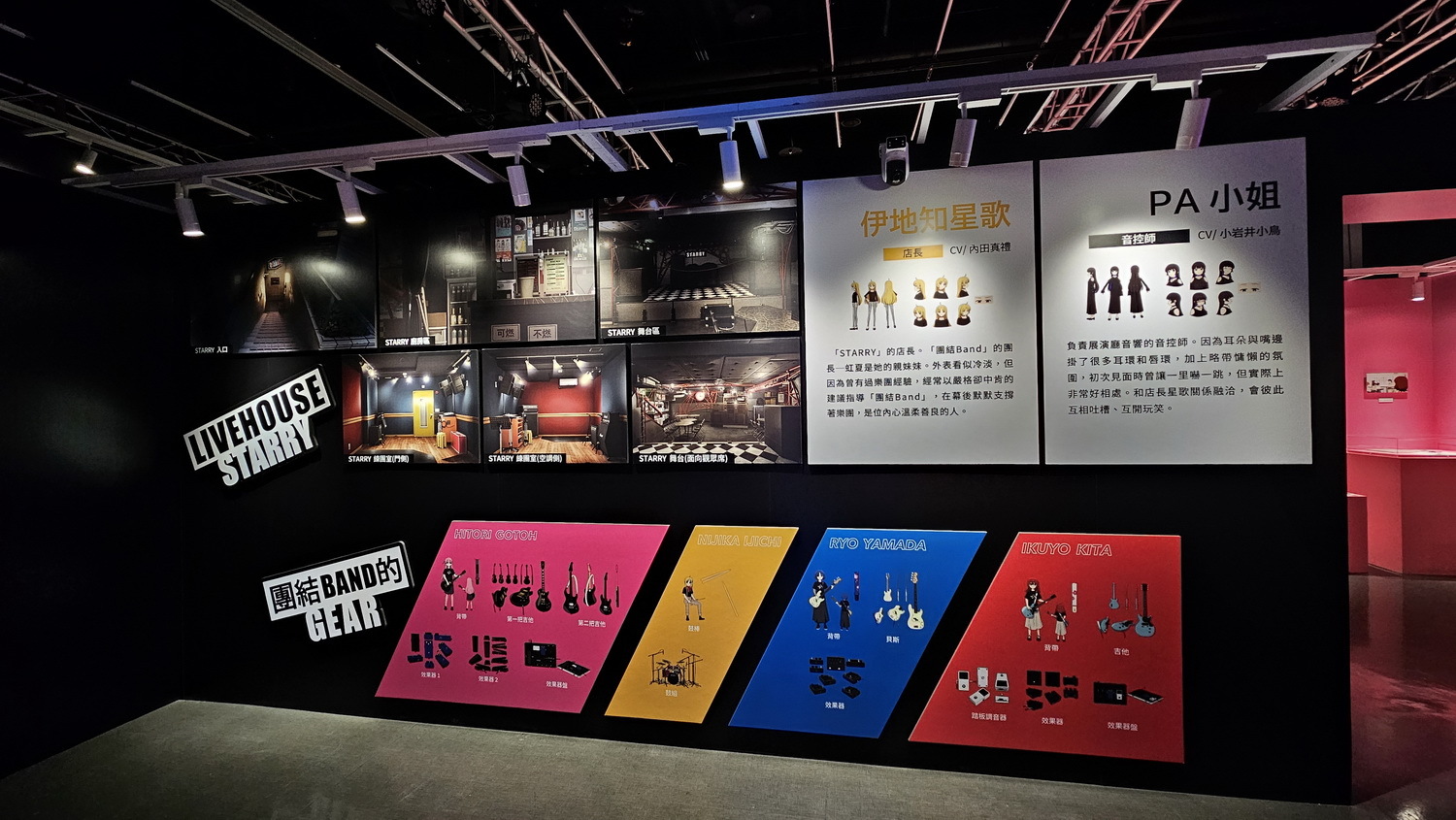 《孤独摇滚!》动画展共规划九大特色展区,“小孤独的衣橱”是小孤独通往吉他英雄的道路的起始点,衣橱内的每张海报、设备,连棉被都完整复制;“STARRY 展演厅”为作品中最重要的音乐圣地,100% 真实还原 live house 场景,从舞台、灯光到音响配置,让人仿佛亲临下北泽的现场演出;“渴望被肯定的怪物”巨大实体化,整个空间搭配互动影音,各种迷因画面交错出现,直接进入小孤独的脑内幻想世界。最后还有大型多媒体影音室及作者、导演及动画相关人员签名色纸展示。
