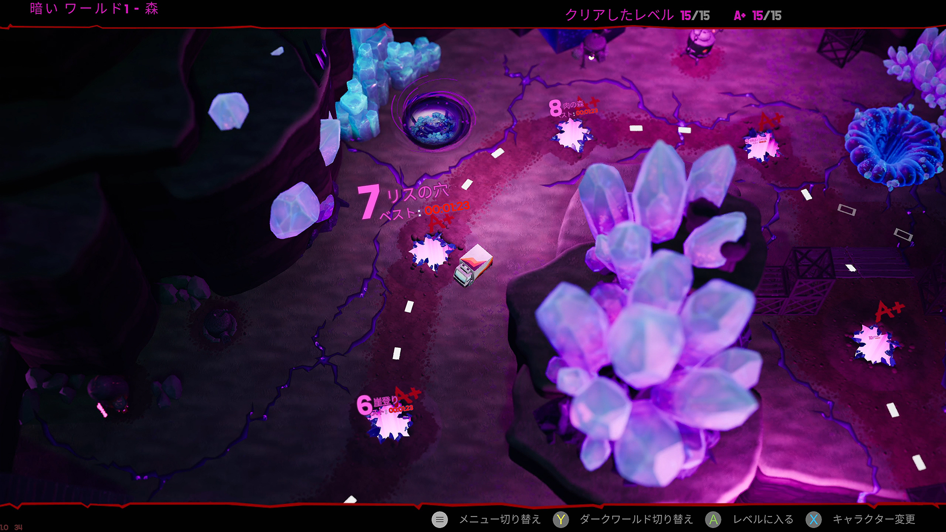 评价要素依旧存在,若在规定时间内通关即可获得 A+ 评价。在获得 A+ 的关卡中会解锁“黑暗世界(Dark World)”,那里有比平时更严酷的挑战等待著玩家。