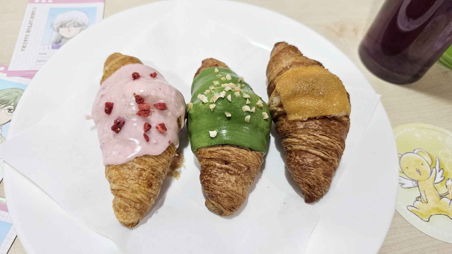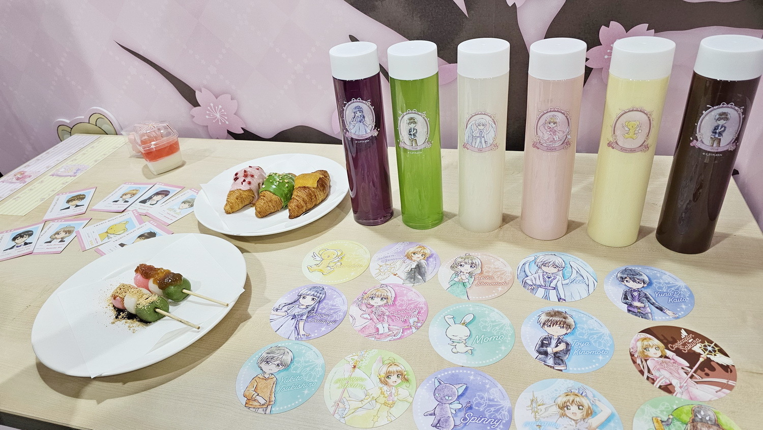 配合春天到来,快闪店推出全新设计的限定餐点,从外观到风味皆呼应透明牌篇的轻柔氛围:“粉樱缎带”樱花果冻奶酪杯,以淡粉色的樱花果冻搭配奶味浓郁的白色奶酪,盛装于爱心造型容器中,层次柔和细致。“樱之日和”有粉、白、绿三色团子两串,日式甜酱油与黑糖黄豆粉,双重口味一次满足。“樱色梦语”特制的樱花造型马卡龙,色彩柔和,充满春日气息。“樱之午后”则有小可颂三入(草莓巧克力/浓抹茶/烤糖起司),如同春天午后的悠闲时光。现场凡消费奶酪/团子,随机获赠 角色小卡乙张(共 9 款),凡消费马卡龙/可颂,随机获赠角色小卡两张(共 9 款),限定角色小卡皆为大头照风格,可爱配色与镭射质感。