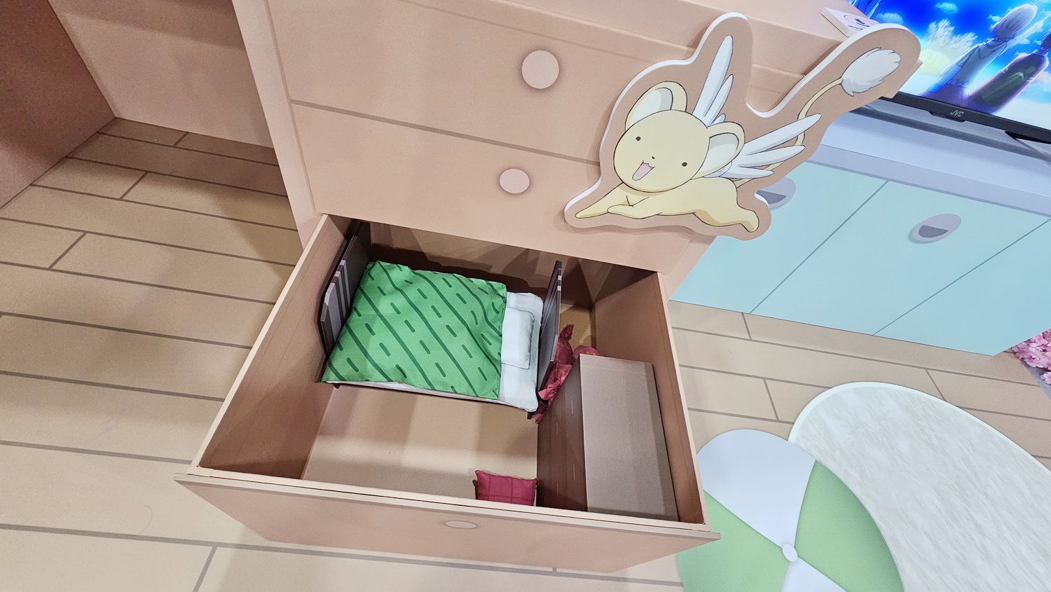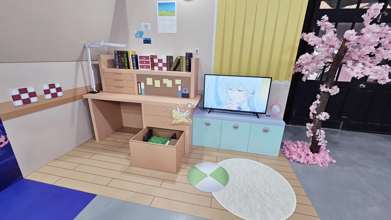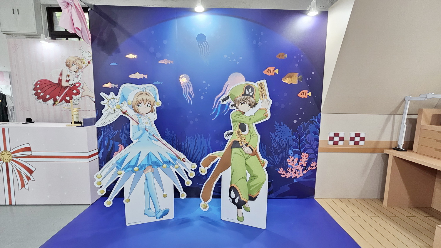 快闪店打造多处动画经典场景,让人仿佛走进故事中的某个片刻。包含 “小樱的房间”,特别制作小可睡觉的抽屉,还原小可的专属小天地;“小樱与小狼一同前往的水族馆”,以静谧蓝色调营造两人回忆中的温柔氛围;以及 “友枝中学的花园穿廊”,重现小樱、小狼与知世经常讨论事情的日常场景。现场同时设置 “透明牌装置”,可实际走入其中拍照,仿佛自己也成为牌面的一部分,可穿上春天气息的服装,搭配透明卡牌框,留下专属于自己的纪念画面。本次快闪店更特别展出复活节主题绘图,角色们换上节日服装,以柔和色彩描绘春天气息。