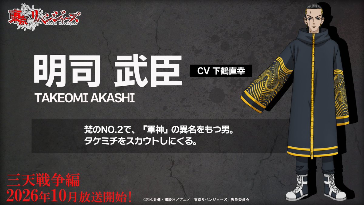 由 和久井健 所著作品改编《东京复仇者》,电视动画最新作《东京复仇者 三天战争篇》。就在 29 日举办的“Anime Japan 2026”中正式告知动画将自 2026 年 10 月起开始播映,并释出动画的第二波宣传影片和追加角色&声优等情报。