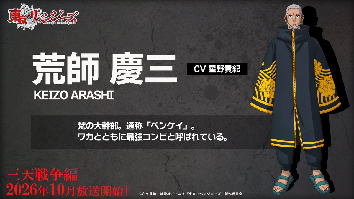 由 和久井健 所著作品改編《東京復仇者》,電視動畫最新作《東京復仇者 三天戰爭篇》。就在 29 日舉辦的「Anime Japan 2026」中正式告知動畫將自 2026 年 10 月起開始播映,並釋出動畫的第二波宣傳影片和追加角色&聲優等情... 最后编辑由 不存在的铃喵