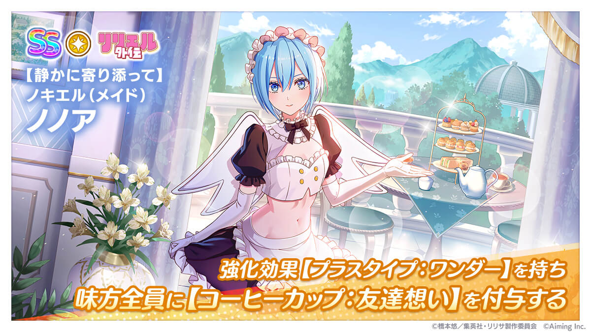自 4 月 1 日推出的理理庆典转蛋角色,【静かに寄り添って】诺基艾露(女仆)诺诺亚 是名阿修佛德战记主题 SS 闪耀(黄)属性角色、【まばゆく満ちて】亚莉艾露(女仆)喜咲亚理亚 是名阿修佛德战记主题 SS 奇妙(绿)属性角色,于理理庆典转蛋中 SSR 角色出现率提升为 4 %。