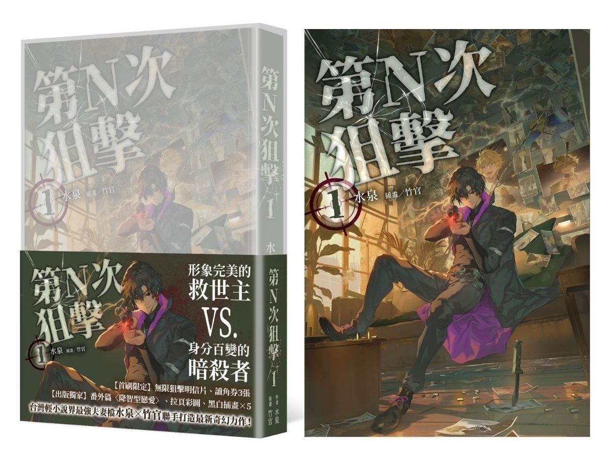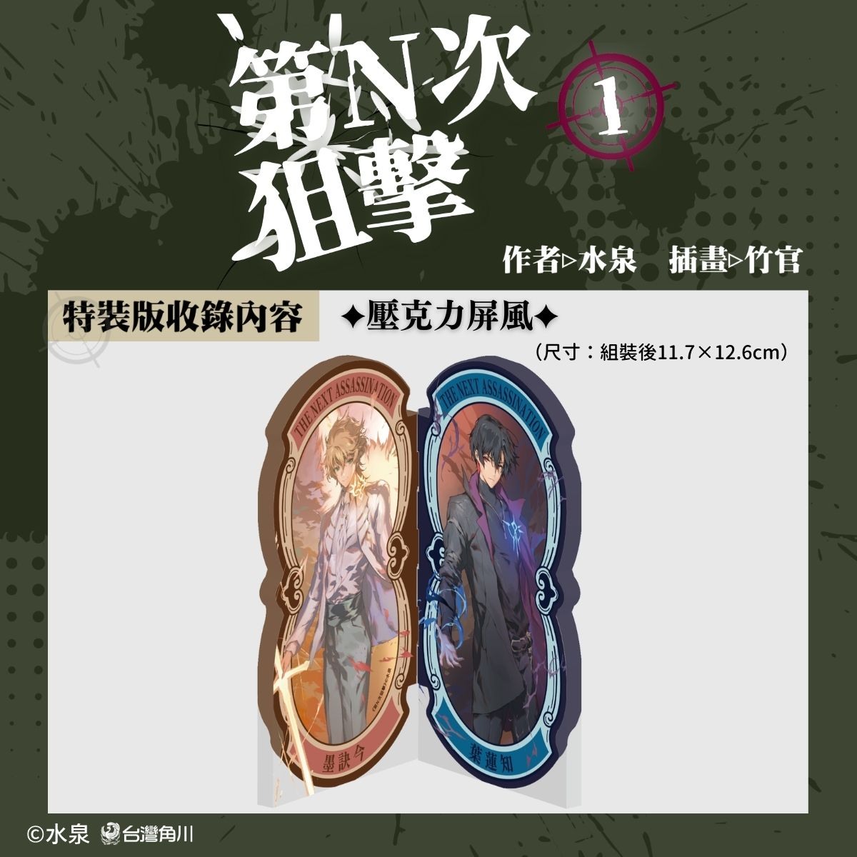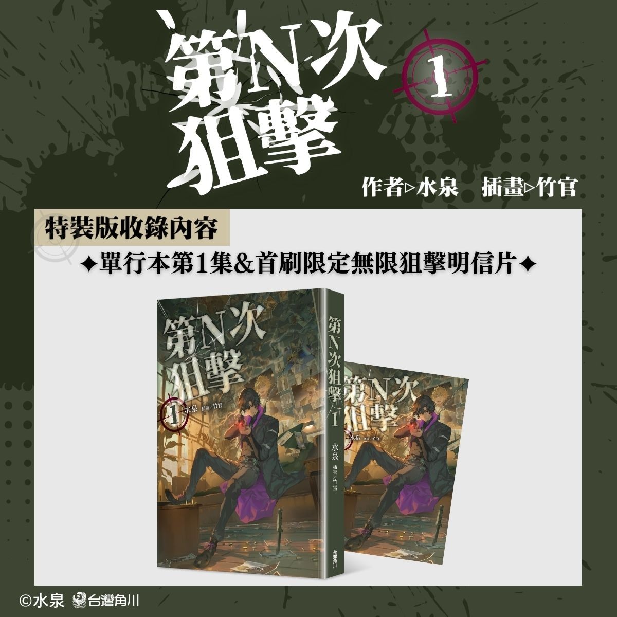 世人皆被蒙蔽,唯有他为阻止毁灭而孤军奋战──《第N次狙击1》将推出一般版、典藏特装版与电子书版。一般版首刷特典为“无限狙击明信片”(※首刷售完即无赠品)、KadoKado 角角者“读角券3张”,特装版则多收录呈现“救世主与暗杀者”对立场景的限定周边“压克力屏风”和“精美对立典藏画”。电子书版则于5/1(五)上架并附赠专属特典书卡。无论实体书或电子书,读者都能完整珍藏水泉老师的最新力作《第N次狙击1》。