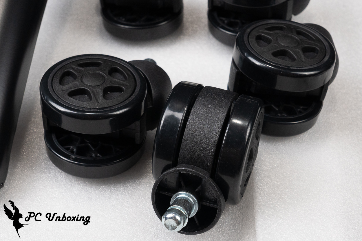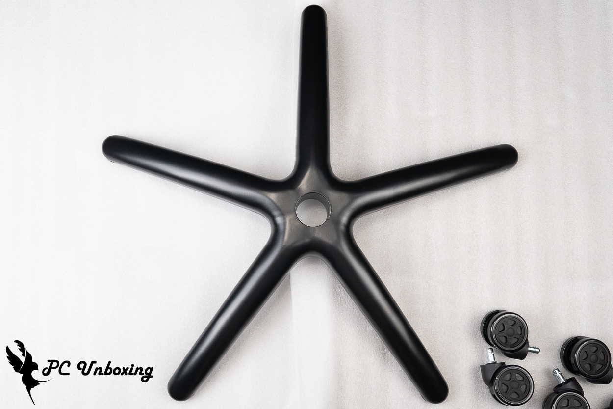 椅脚则是使用金属钢制材质的五星爪,表面涂层部分则有黑色烤漆作为保护层,减少长时间使用后的氧化及刮伤的可能,PU 轮子直径 Ø 65 mm 外观设计上相对简约朴素。