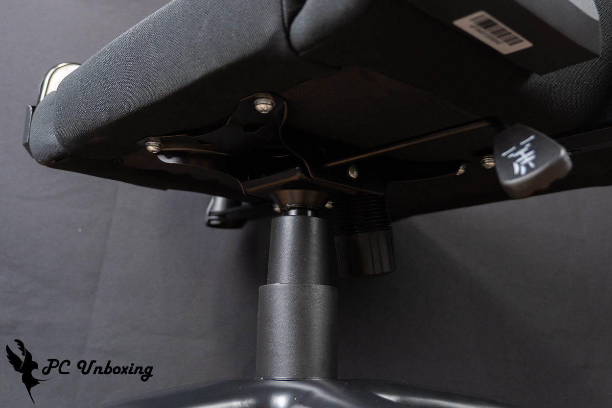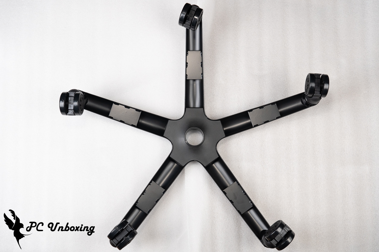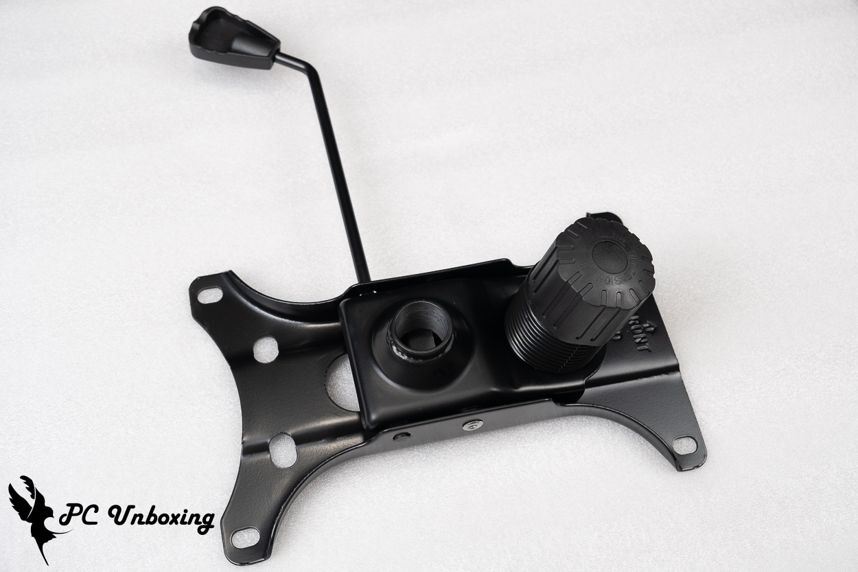 XPG NEXUS 电竞椅使用 Class 4 气压棒,底座托盘采用蝴蝶结构托盘,而中间圆柱体为辅助气压棒的弹力调整钮。