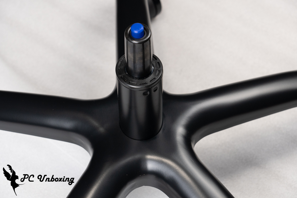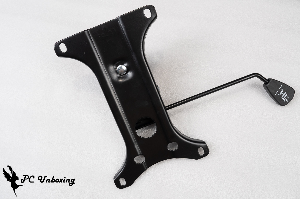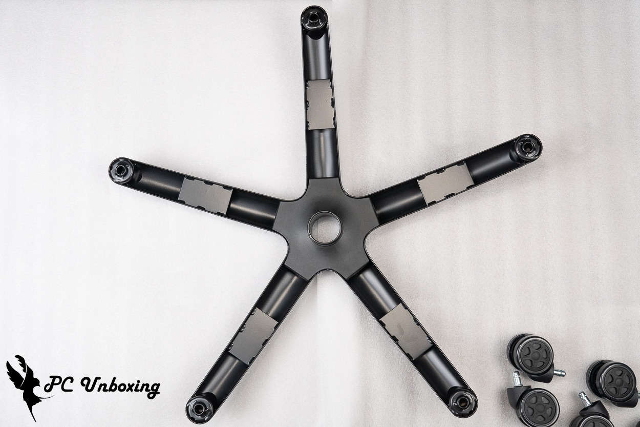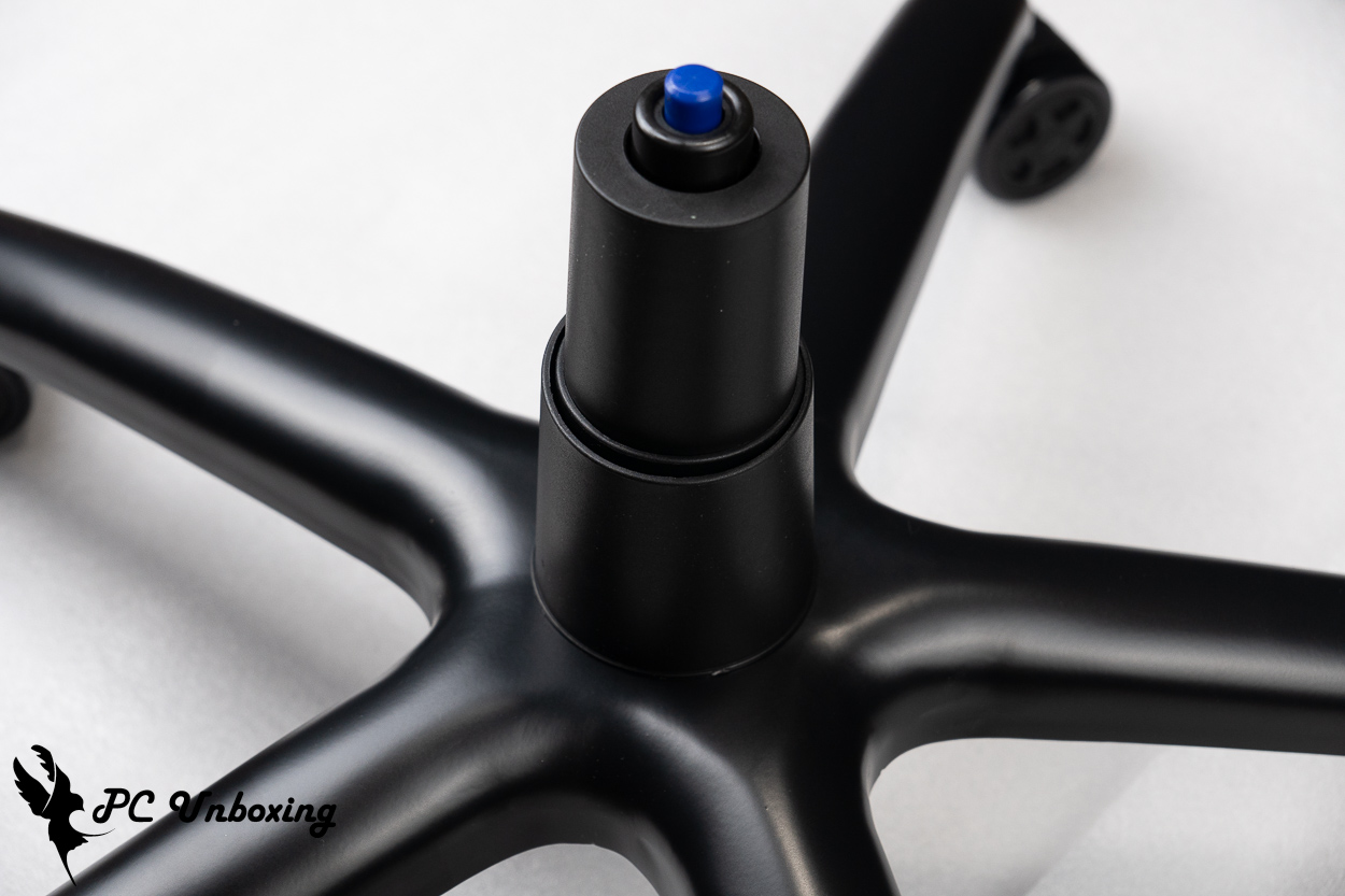 XPG NEXUS 电竞椅使用 Class 4 气压棒,底座托盘采用蝴蝶结构托盘,而中间圆柱体为辅助气压棒的弹力调整钮。