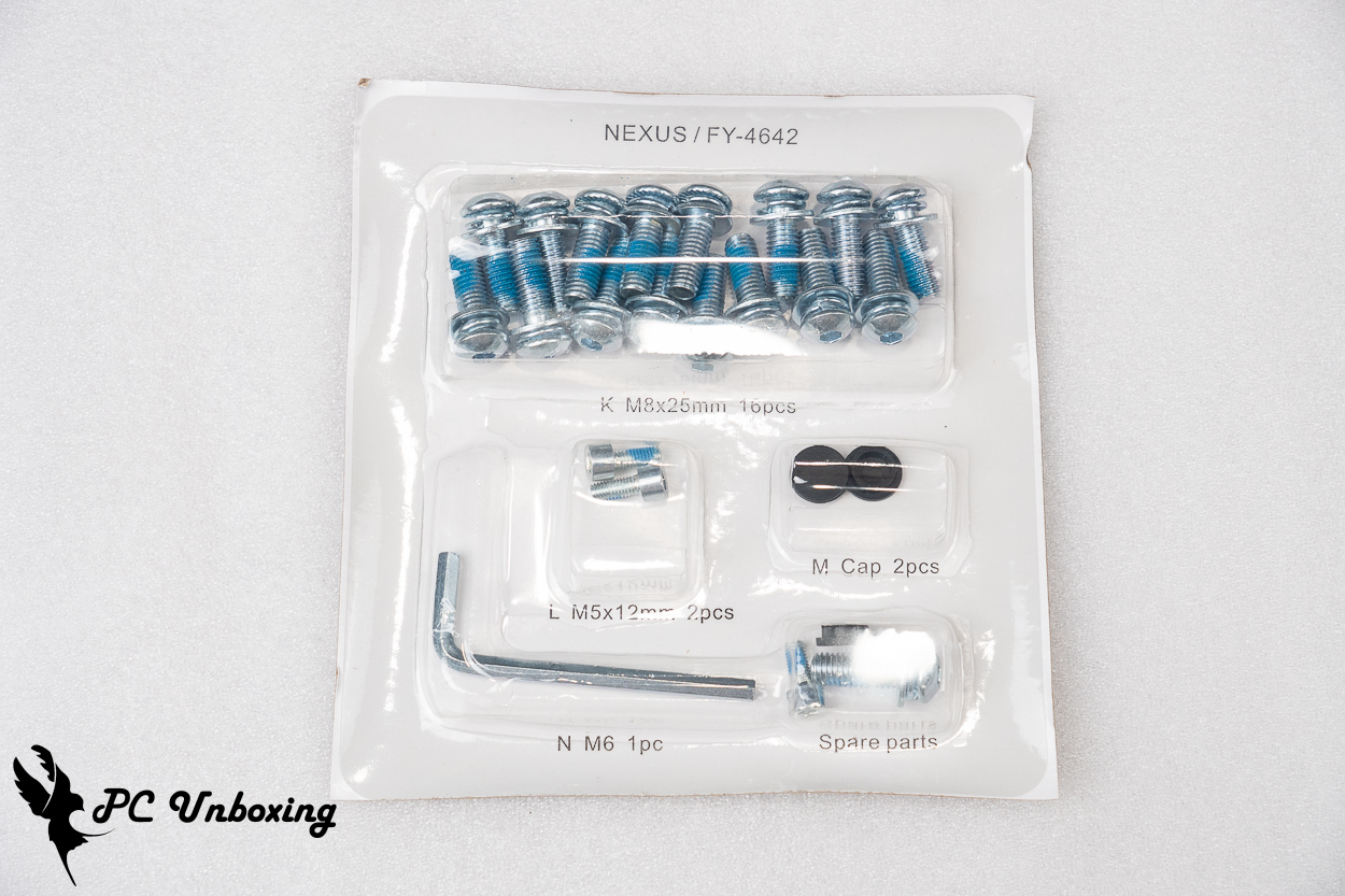 固定螺丝使用泡壳方式包装,有使用文字标示每个螺丝的尺寸、代号、数量,并各自多提供 1 pcs 备品预防大家手滑。