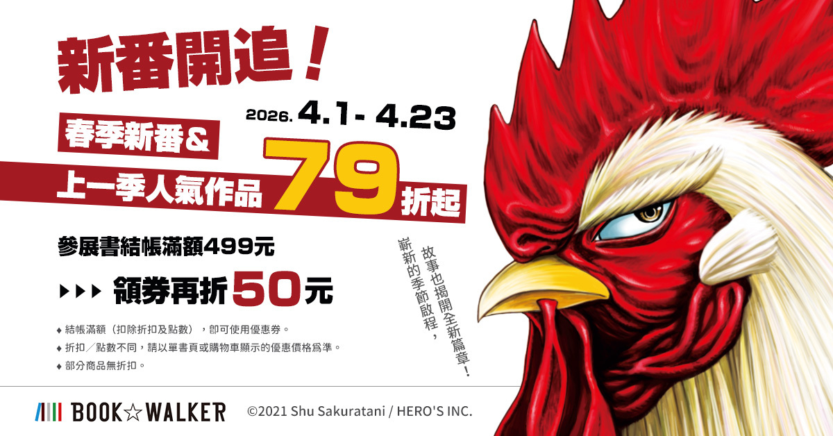 随著动画新番陆续开播,官方也推出了“新番开追!春季新番&上一季人气作品书展”。即日起至4月23日,参展作品 79 折起,活动页同步可领取 50 元优惠券。参展作品包括《鸡斗士》、《朱音落语》,以及《轮回的花瓣》等作品。出版社也推出期间限定套书优惠,即日起至 4 月 14 日,《冰之城墙》、《婚姻剧毒》、《入间同学入魔了!》和《关于我转生变成史莱姆这档事》(漫画版)等作品套书限时 8 折。