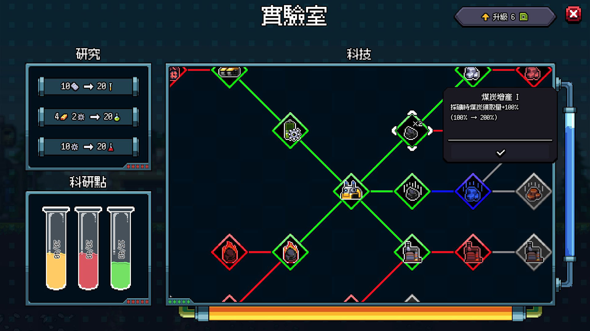 在“实验室”(Laboratory)中,玩家可以消耗研发点数来解锁“改变游戏规则”的技术,让游戏产生不同体验。例如“太阳能助力”与“自动充电”技术,让奇普返回地面时即可瞬间补满能量,不需要手动操作,或者解锁“三倍”甚至“五倍”挖掘范围,一键清空大片矿区。