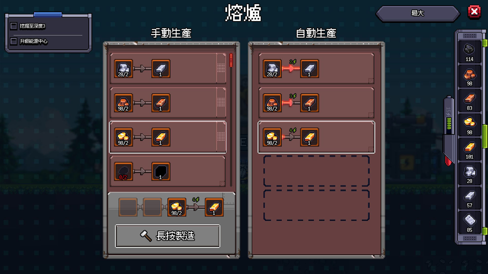 官方表示,《地心工业线》的核心特点在于玩家不需要复杂的管线建设与管理,就可以搭建出一套生产矩阵,不论是建造熔炉、精炼机、组装机、加工机等生产复杂的科技组件,随著工厂等级提升,自动生产槽位将不断解锁,确保即便玩家深处地底,工厂仍能 24 小时不间断运转。
