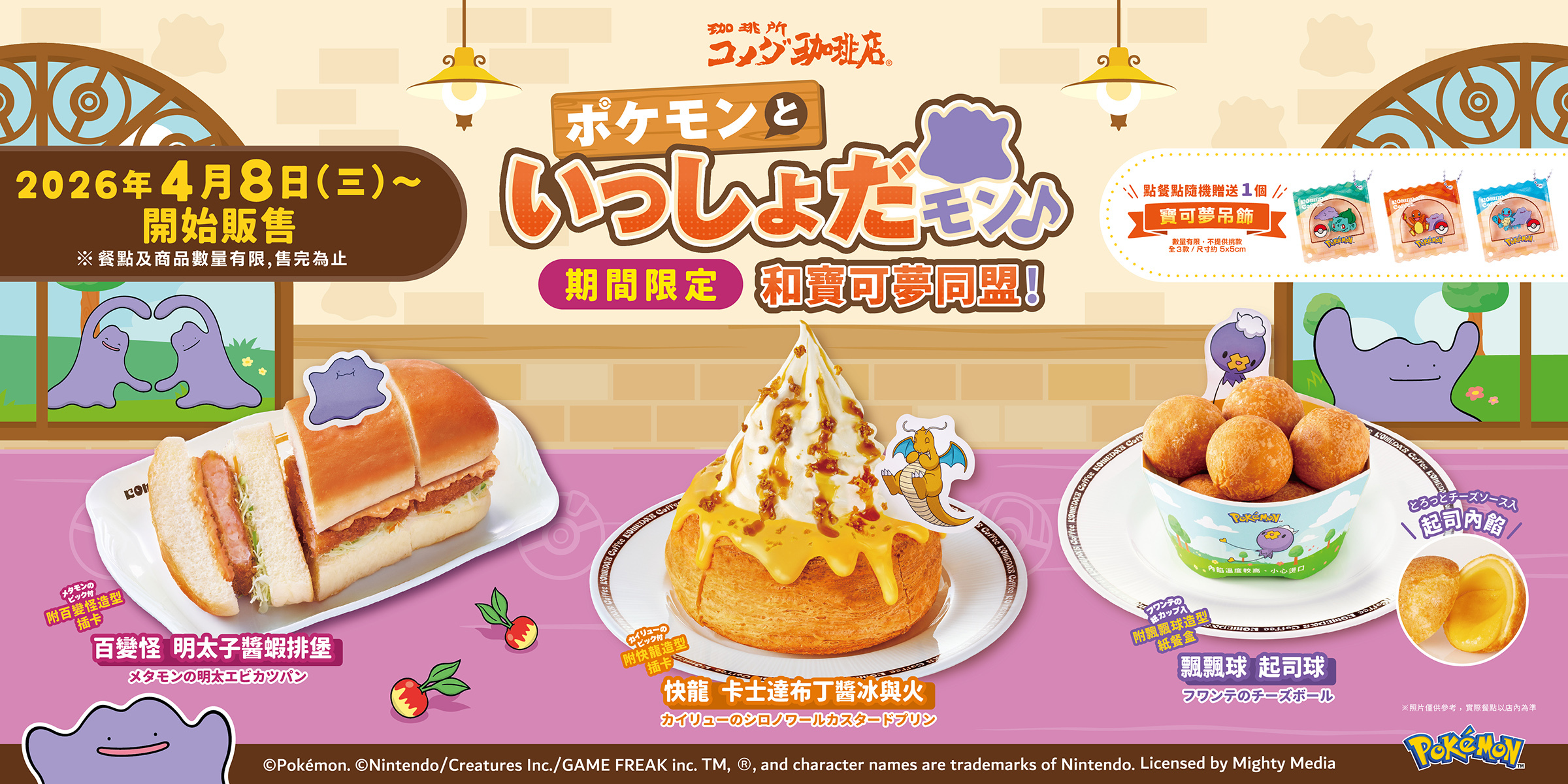 台湾客美多宣布,将于 4 月 8 日(三)起推出“和宝可梦同盟!”期间限定菜单,品项包含“快龙 卡士达布丁酱冰与火”、“百变怪 明太子酱虾排堡”、“飘飘球 起司球”等,点餐点随机赠送一个宝可梦造型吊饰;另有宝可梦造型收纳瓶,亦将推出可抽选“百变怪造型插卡的明太子酱虾排抱枕”的活动。