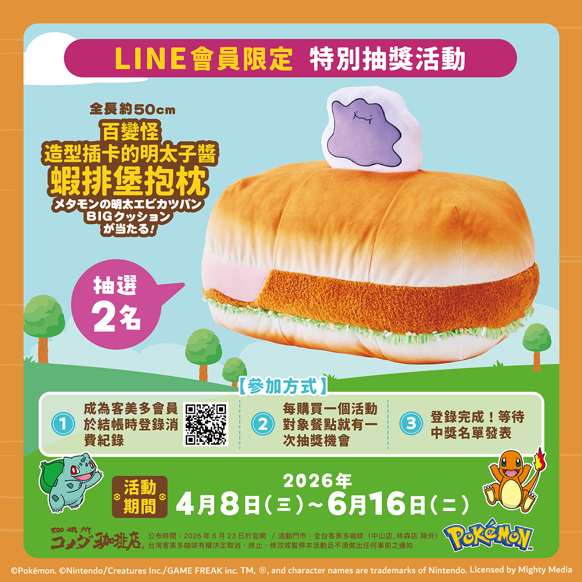 4/8~6/16 只要是客美多咖啡会员,点宝可梦餐点并于结帐时登录就有机会可以抽百变怪造型插卡的明太子酱虾排抱枕,共抽出 2 名。
