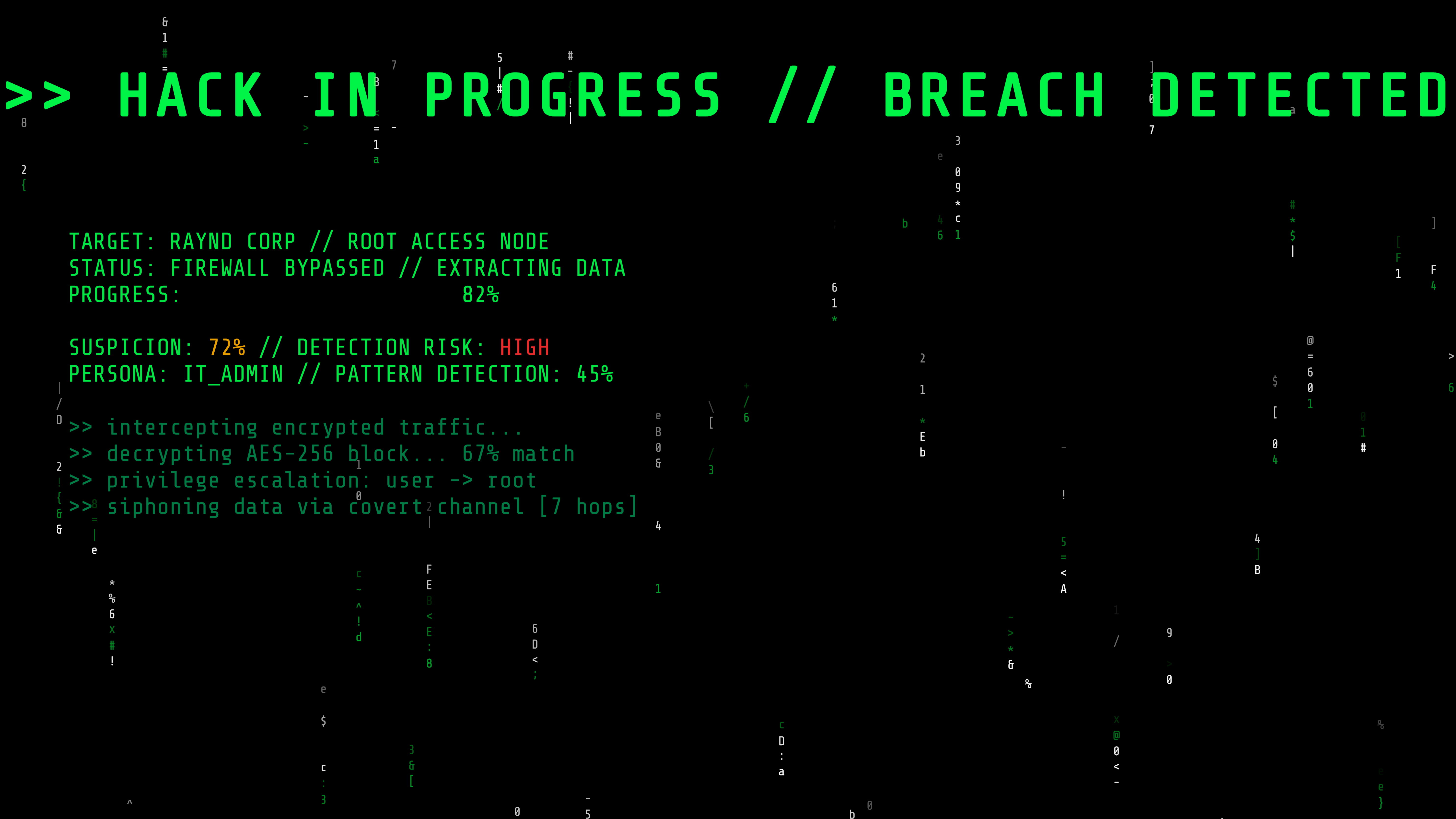 《别离开办公桌》是一款赛博庞克放置型点击游戏,玩家将扮演 RAYND Corporation 的员工,你的职责就是让自己看起来像个员工。白天时,你要像个正常员工一样点击报告、工作,将怀疑度保持在低点;到了夜晚,你要入侵公司机密,累积点数,并管理你的伪装人格。在网路深处隐藏著某种东西,而它知道你的名字。
