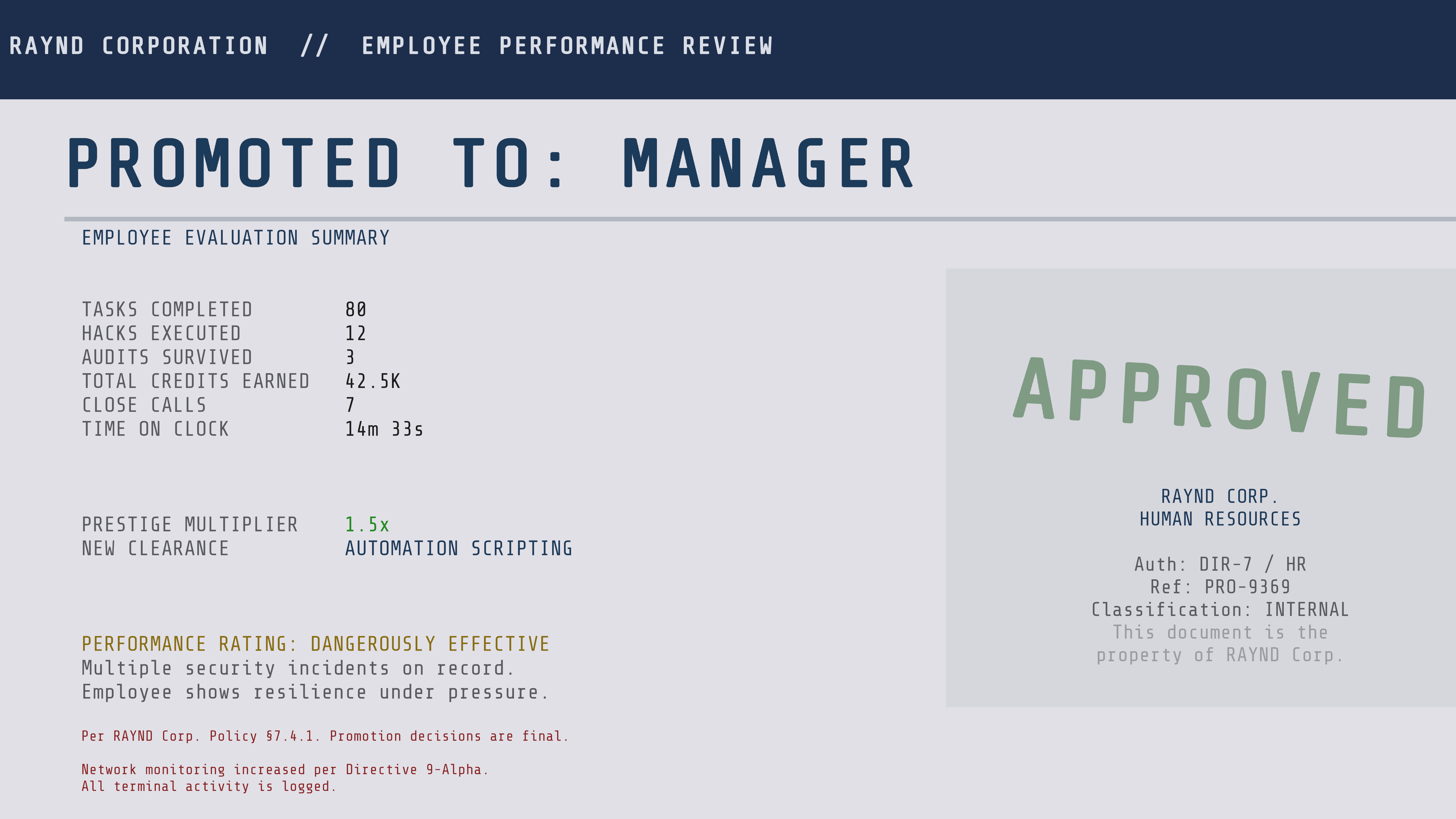如果做得太过火,怀疑度会上升,你将被审核、拷问、最后被解雇(处决)。但若能够保持平衡,更深入挖掘公司秘密,你就能获得晋升,取得更高的权限、进入更深层的系统。玩家得在企业审查下限时回答问题,还需要善用 6 种人格来逃避检测,但如果使用同个人格太久就会失效。