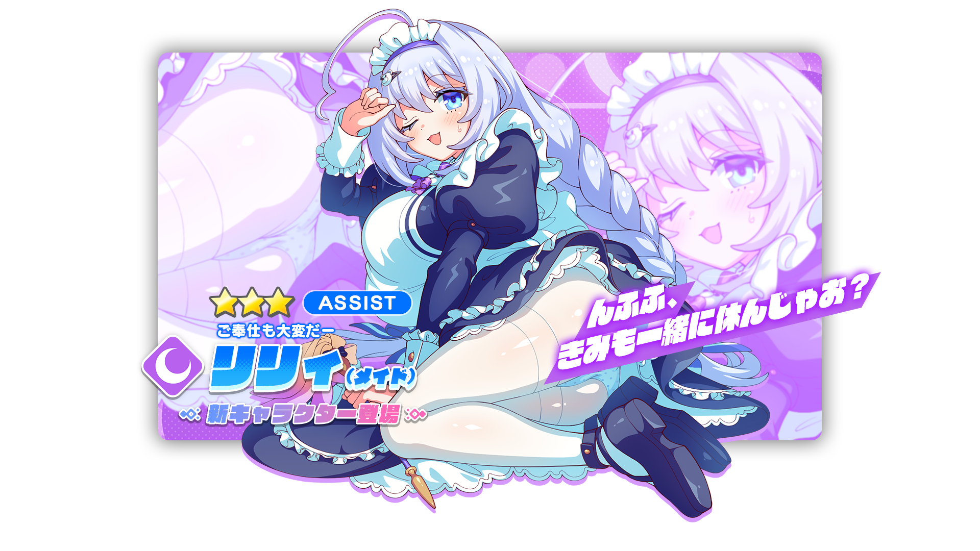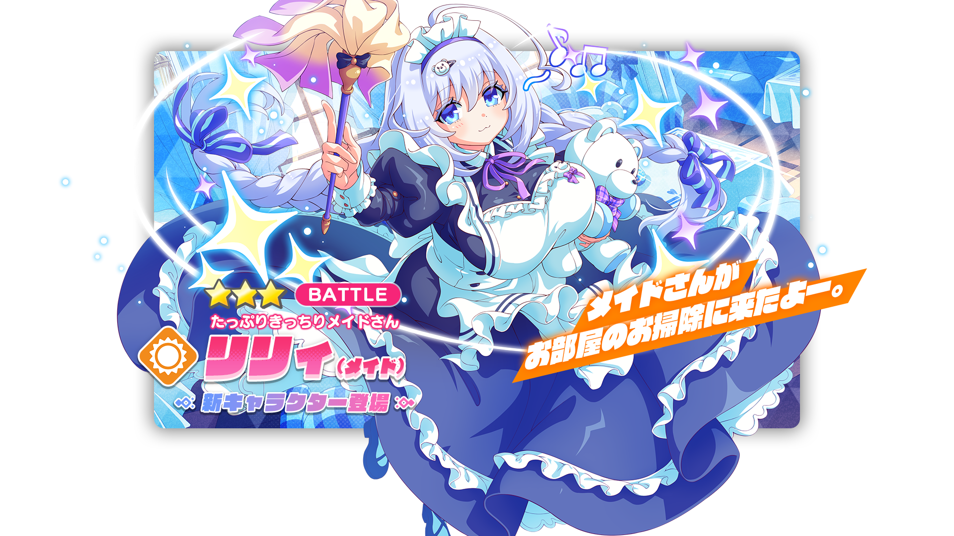 本次 PU 的新角色为《泰克罗诺斯》原创 ★3 战斗 [丰满严谨的女仆小姐]莉莉(女仆) [たっぷりきっちりメイドさん]リリィ(メイド) 以及 ★3 支援 [侍奉也是很辛苦的呢]莉莉(女仆) [ご奉仕も大変だー]リリィ(メイド) 。