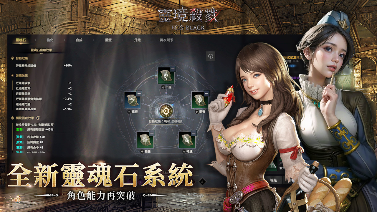当角色成长到一定阶段后,“灵魂石系统”将为你带来更进一步的强化效果,透过不同品质的纹样、形状,组合出你独一无二的角色战斗力吧!灵魂石可于每周副本“欲望迷宫”中掉落的“灵魂石随机宝箱”取得,不同灵魂石拥有各自的能力加成、品质与稀有度;针对已取得的灵魂石,还可再进一步行强化、合成与重塑,灵魂石共有 8 种形状与 5 种纹样,不只石头本身具备能力加成,若能配备相同形状的石头,还可额外发动灵魂石的套装效果,赋予自身更强大的能力值属性!