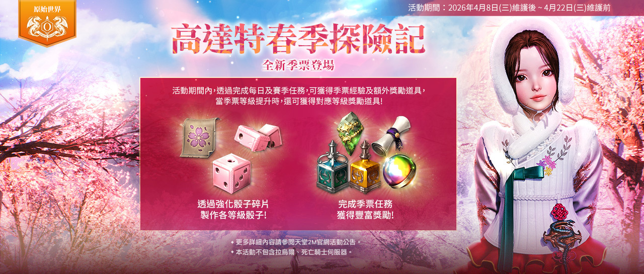 所有世界【春季探险记】:4/8 维护后~ 4/22 维护前,活动期间内,“年长探险家 (活动)”于游戏内登场,可以使用金币向其购买活动神谕之书“探险家的足迹 (活动)”。完成活动神谕任务后,可以获得专用活动财货“探险信物”以及各种奖励;“探险信物”则可以用来向“年长探险家 (活动)”购买活动宝箱与恩宠圣物。(※各伺服器 NPC 登场位置不同,探险信物与宝箱名称也有所不同)
