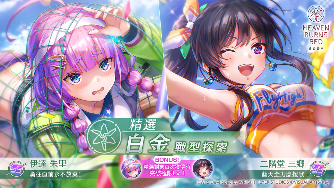 本次的“精选白金战型探索”中,SS<灵魂共振>[蓝天全力应援歌] 二阶堂三乡、SS<灵魂共振>[勇往直前永不放弃!] 伊达朱里的新战术型态,经精选出现机率上升!