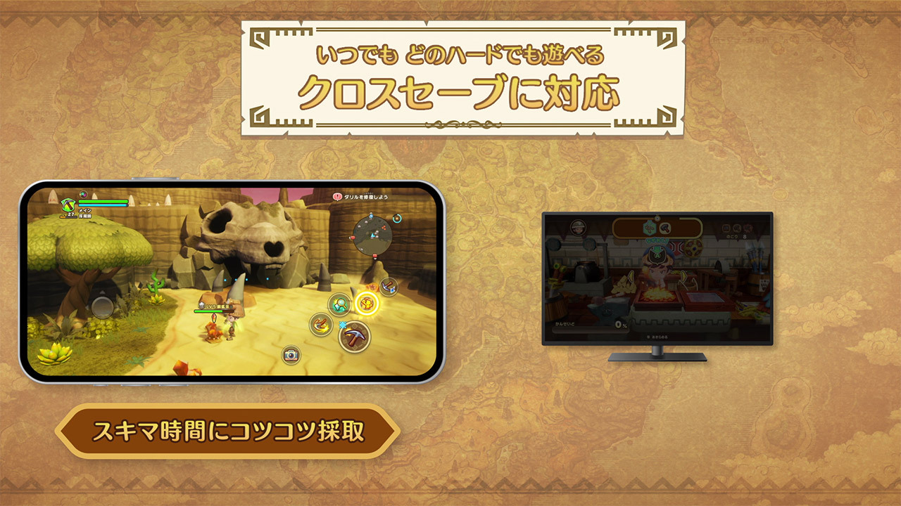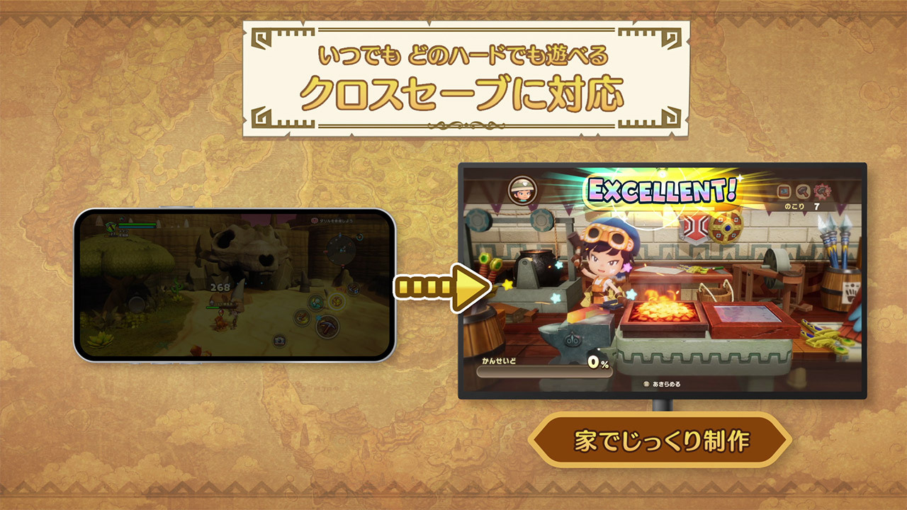此外,手机版也将支援跨平台存档(Cross Save)与跨平台游玩(Cross Play)。举例来说,玩家可在外出时利用零碎时间透过手机慢慢采集素材,回到家再用家用主机等平台进行更完整的制作与游玩;而跨平台连线则可让不同装置的玩家彼此连线同乐。