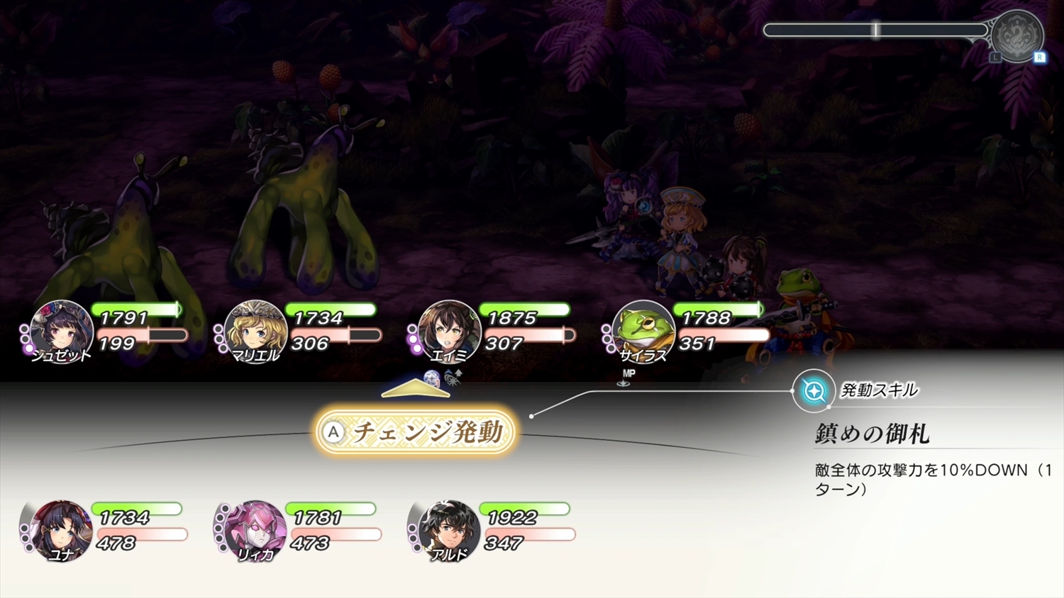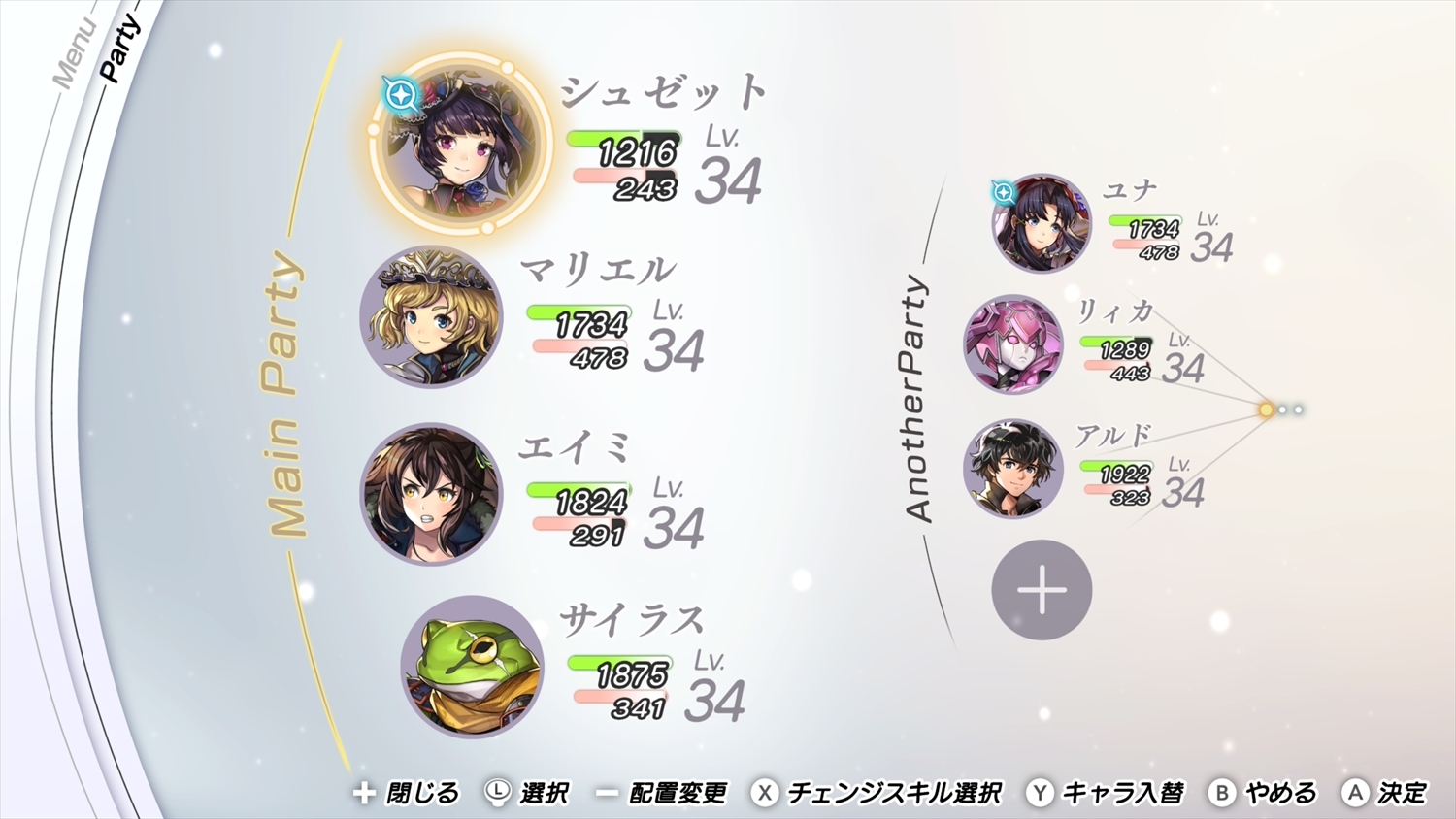 队伍可以编制为“主队伍(Main Party)”与“副队伍(Another Party)”。战斗中使用“变换切换(Variable Change)”可切换队伍,发动时还会根据切换上场的队员使出对应技能。若有好好培育队员,虽然很想频繁使用,但因为无法连续使用,必须注意发动时机。