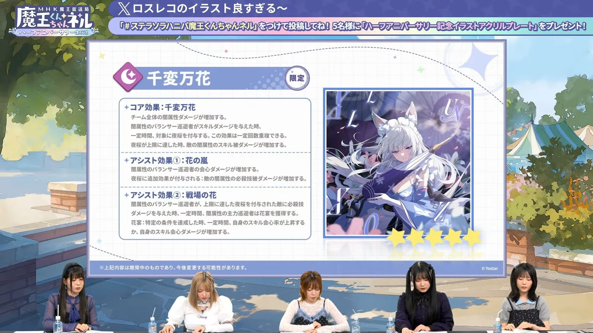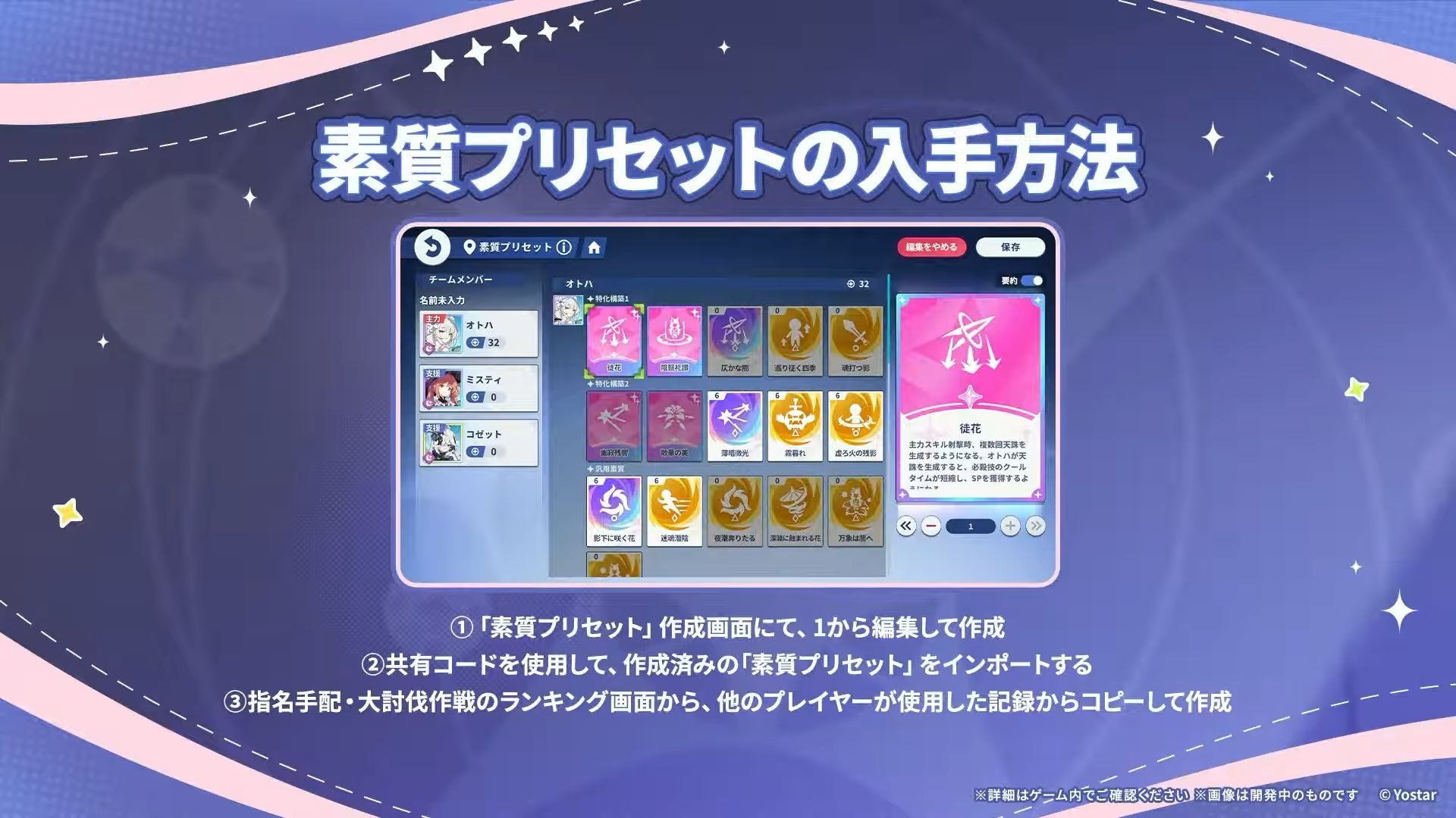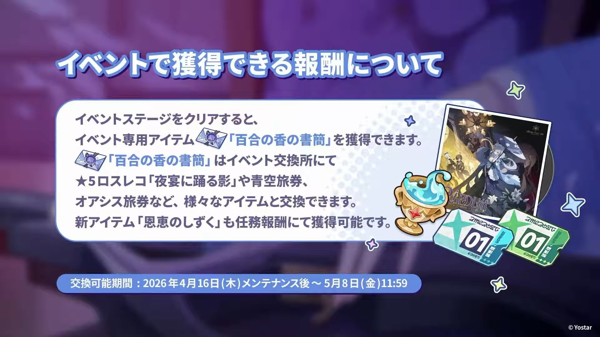 配合新活动的登场,五星限定旅人“乙叶”的招募活动“夜樱落尽月沉沦”,以及五星限定秘纹“繁花幻梦”的招募活动“百合幽香漫烟生”也确定举办。两者将于 4 月 16 日维护后举行至 5 月 8 日。