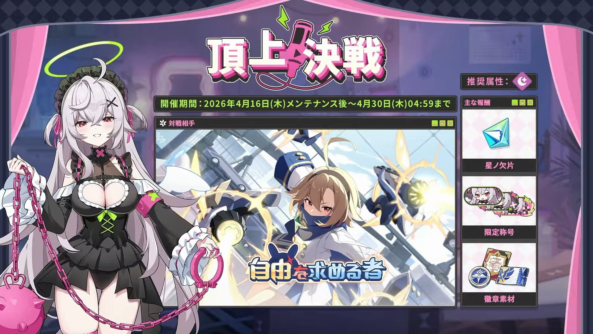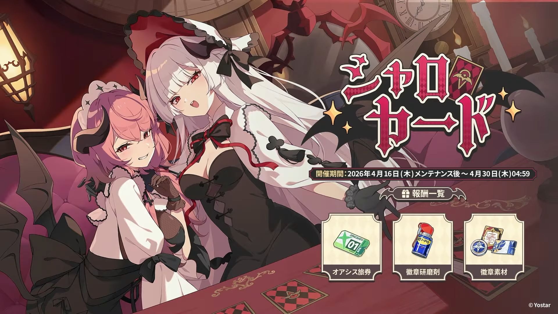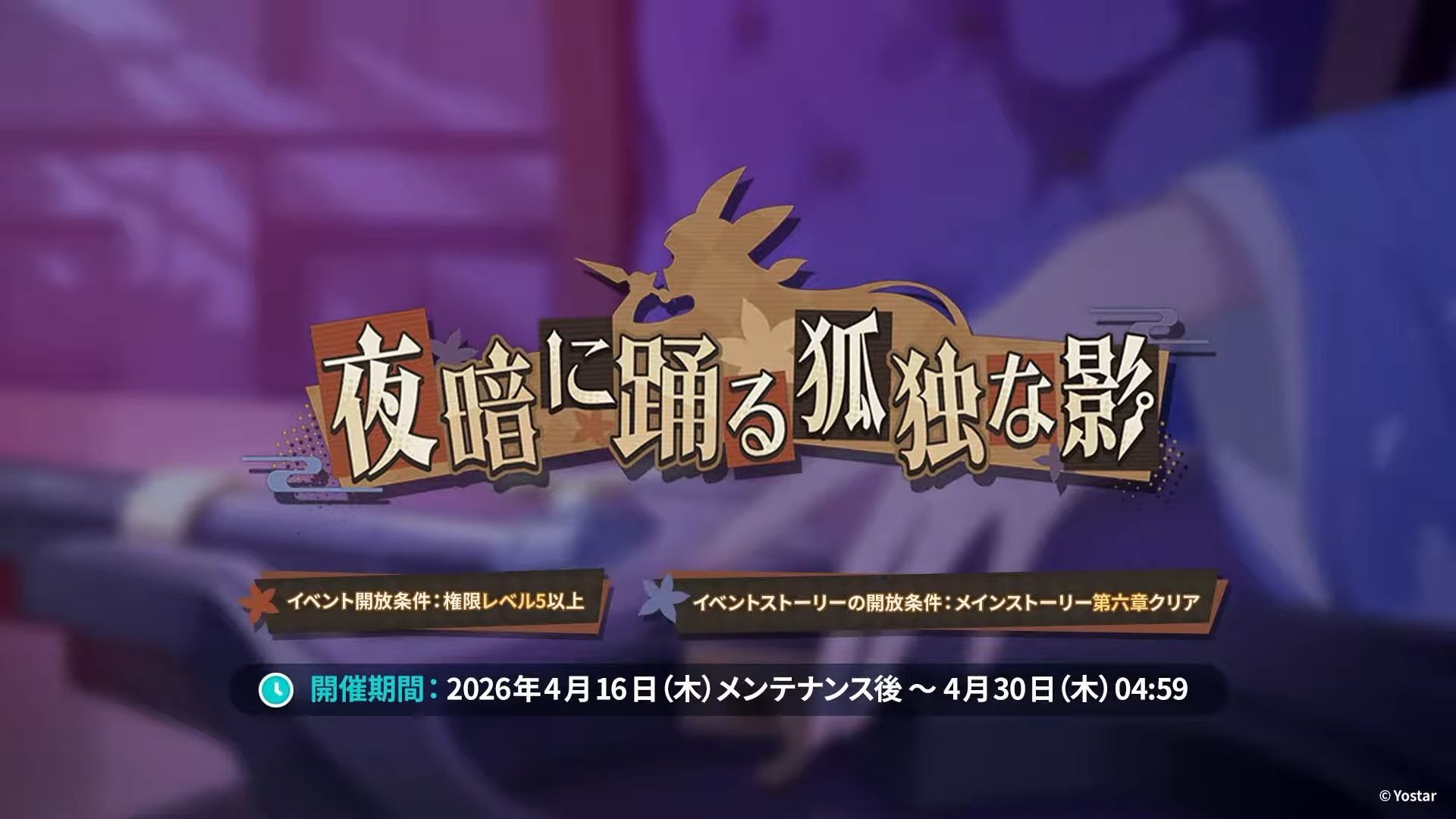 全新活动“幽夜独舞孤影乱”预计于 4 月 16 日维护后举行至 4 月 30 日。活动开放条件为权限等级 5 以上、活动故事开放条件为通关主线故事第六章。本期活动道具可用于兑换五星活动秘纹、青空礼券以及全新道具“圣洁之滴”。