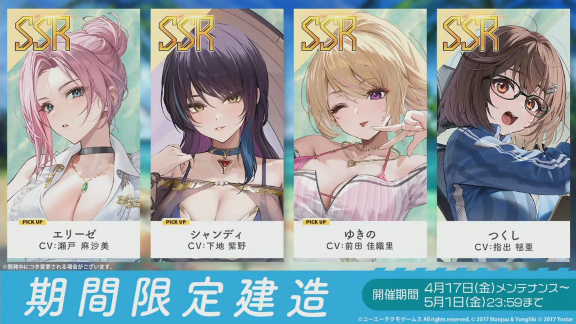 本次 PU 的期间限定建造合作舰船为 SSR 伊莉丝(空母)、SSR 香蒂(重巡洋舰)以及 SSR 千乃(轻巡洋舰)。