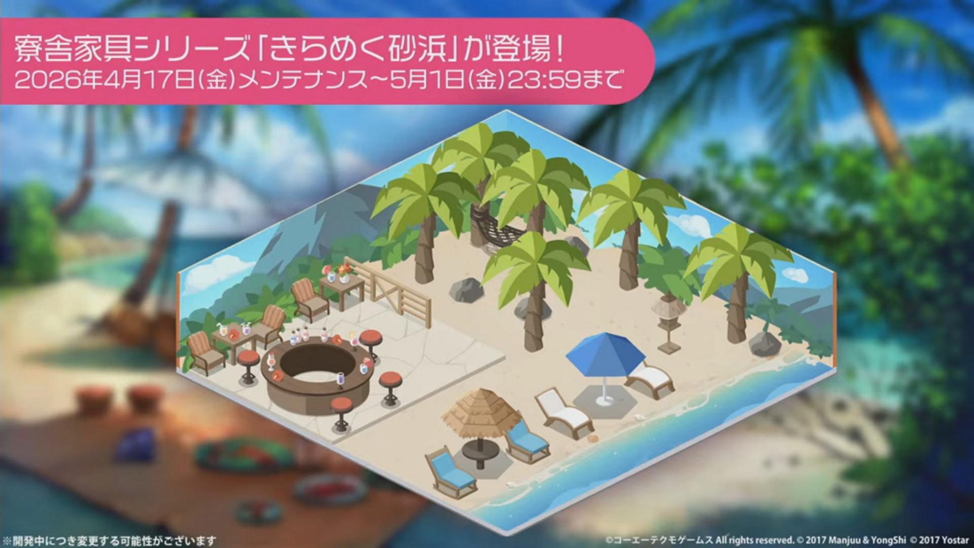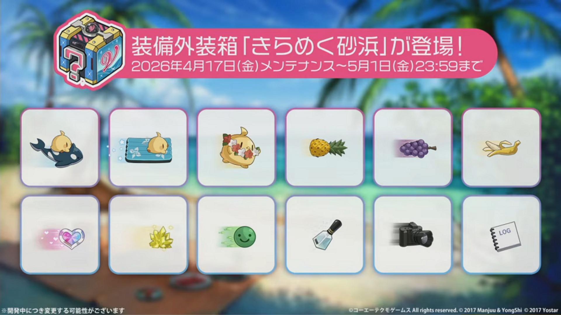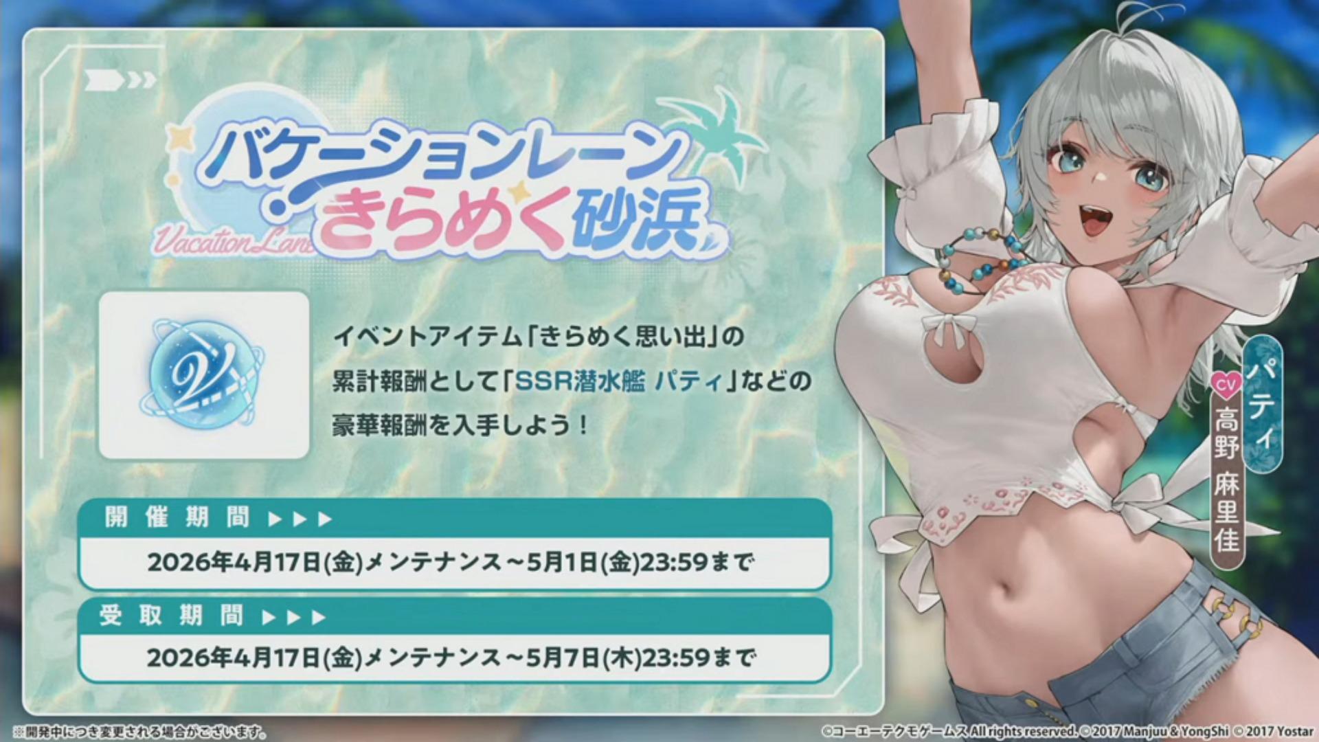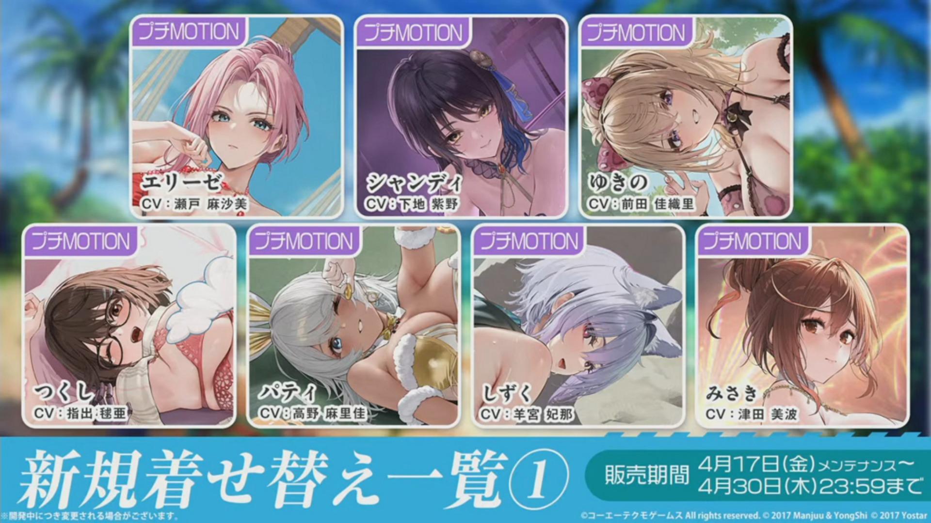 本次推出的期间限定合作换装为伊莉丝“ 某女神的午后 (とある女神の午后) ”、香蒂“ 魅惑的特别饮品 (魅惑のスペシャルドリンク) ”、千乃“ 可爱动物 (キュートなアニマル) ”、筑紫“ 梦机器 (ドリームマシン) ”、雫“ 海滩玩水的少女 (汐游びの少女) ”、派蒂“ 毛茸茸岛屿 (もふもふあいらんど) ”以及海咲“ 在夜空绽放之花 (夜空に咲く花) ”。