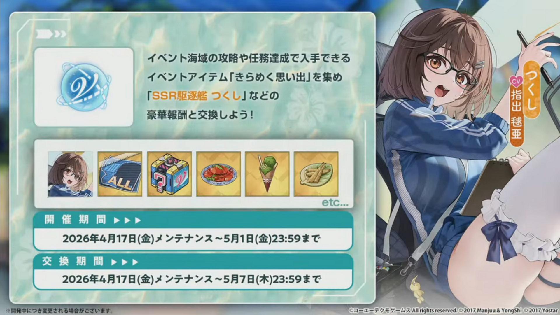 透过攻略活动海域或完成活动任务取得的 闪闪发亮的回忆 (きらめく思い出) 可以兑换 SSR 筑紫(驱逐舰),透过闪闪发亮的回忆的累积获得奖励可以取得 SSR 派蒂(潜水舰);此外攻略特定海域累积获得一定数量的友好度道具可以取得 SSR 雫(战舰)。