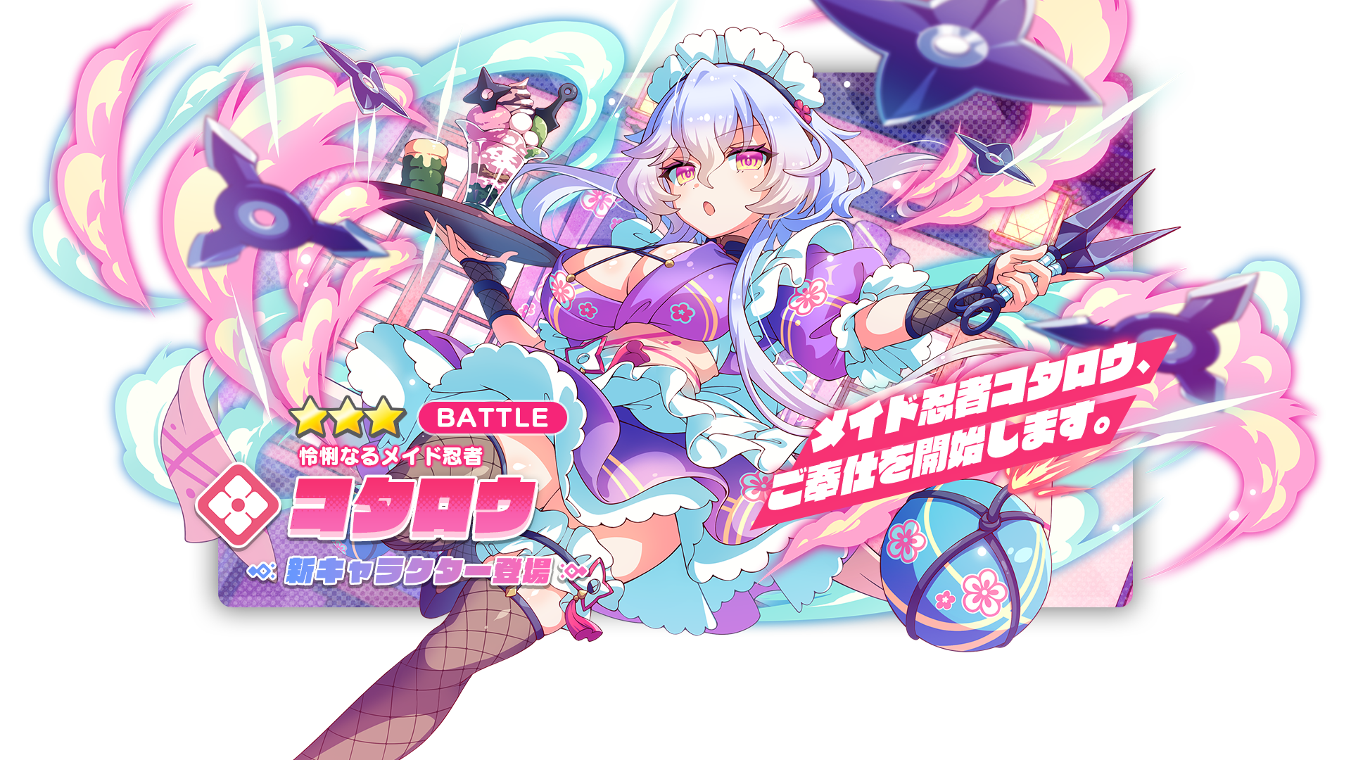本次 PU 的新角色为来自《妖怪大乱斗》的 ★3 战斗 [伶俐的女仆忍者]小太郎 [怜悧なるメイド忍者]コタロウ 以及 ★2 支援 [视线诱导、成功]小太郎 [视线诱导、成功です]コタロウ 。