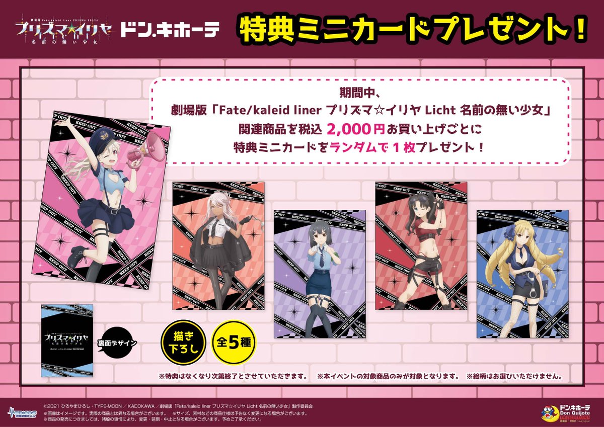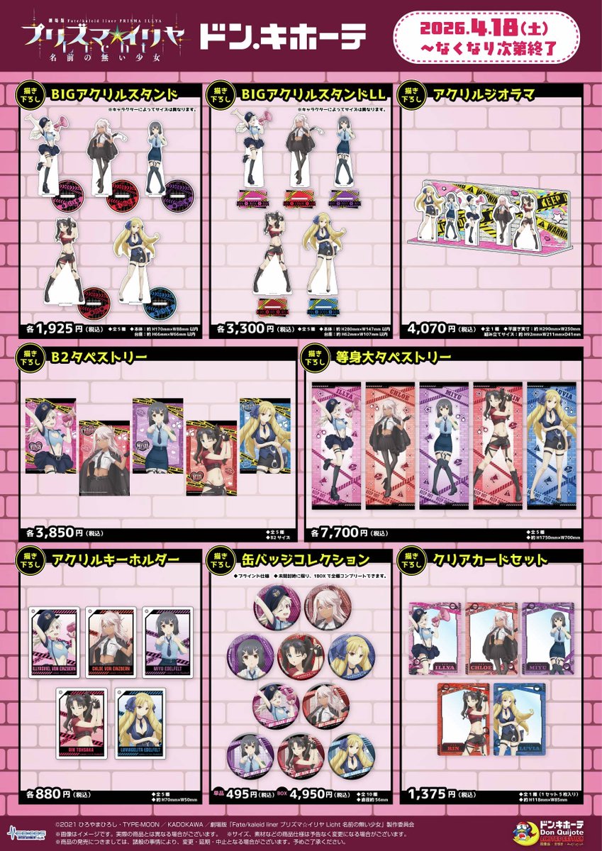 官方表示,自 4 月 18 日起于日本全国唐吉诃德贩售《Fate/kaleid liner 魔法少女☆伊莉雅 Licht 无名的少女》合作商品,当中将会贩售使用全新绘制以“安全”为主题的周边商品。
