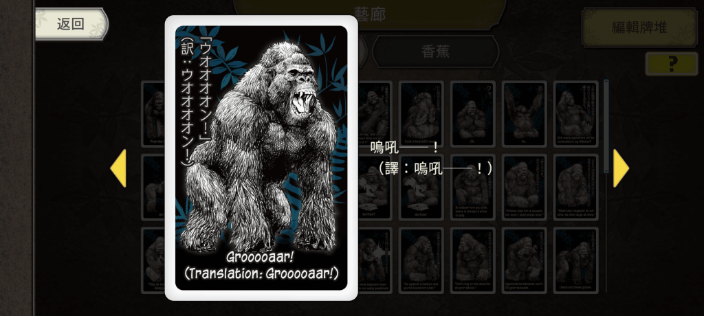 不过,尽管只有两种牌,本作在卡面这块却完全没有因此偷工减料,甚至反而可以说有点用力过猛了,光猩猩牌就有足足57种版本,堪称卡牌游戏中的单卡异图数目之最(当然这样算有点犯规啦)。更关键的是,这些猩猩牌们个个都兼有著异常魔性的卡面与超越人智(?)的说明,趣味性非常高,如果出成LINE贴图肯定很多人会想买(?)。
