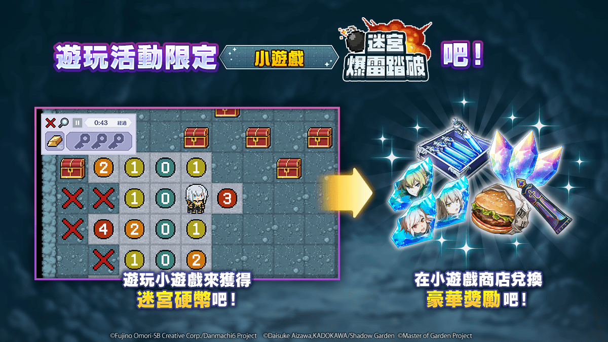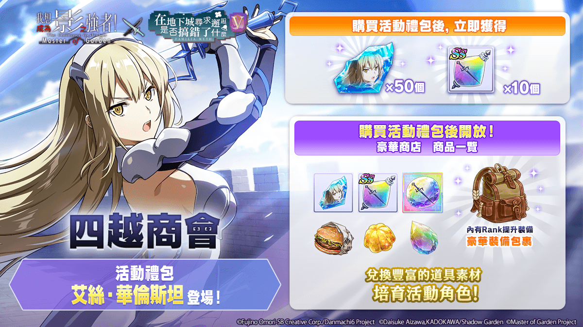 官方表示,自 4 月 16 日(四)举办的‘在地下城出现影之强者是否搞错了什么’合作活动,讲述‘于古书店里找到一本不可思议的书并翻开的那刻,突然被转移到陌生地下城的 席德.贝塔.希妲。在那里遇见的是同样被这个地下城吸引进来的 贝尔 一行人。为了合力脱困,七人一同展开迷宫攻略。迷宫之主为了展现英雄谭,越是前进怪物就变得越强。究竟在迷宫最深处等待等会是 ——。展现力量、能否被迷宫认可成为真正的英雄呢!Shadow Myth 即将在此展开……!’。