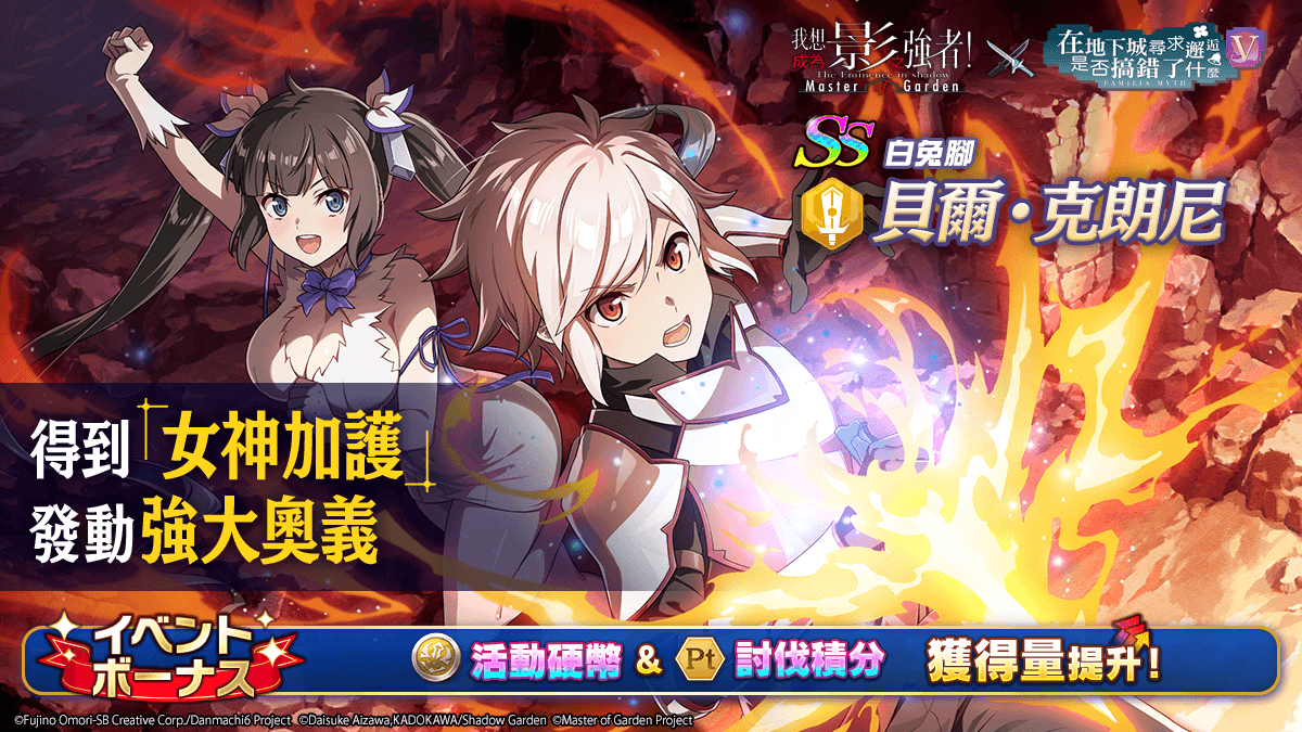 伴随‘在地下城出现影之强者是否搞错了什么’合作活动举行,自 4 月 16 日率先登场的期间限定转蛋卡池角色【白兔脚】贝尔·克朗尼 是名得到“女神加护”来发动强大奥义的黄属性输出角色/【剑姬】艾丝·华伦斯坦 是名透过“风灵疾走”来强化自身并使用“格档”给予敌人追加伤害的黄属性坦克角色,日后则会实装【疾风】琉·璃昂。