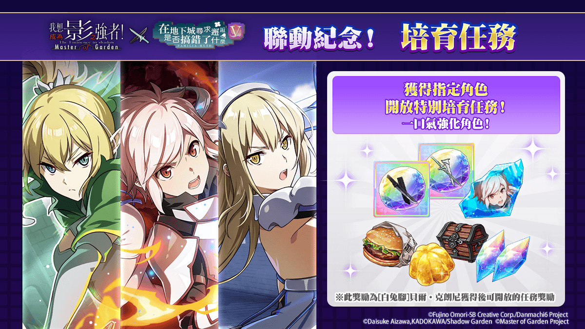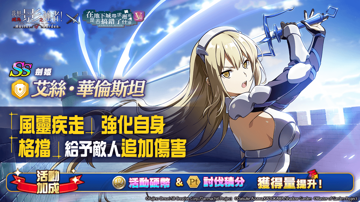 由 KADOKAWA 与 Aiming 携手制作、台湾由大宇资讯旗下星宇互娱所代理,动画《我想成为影之强者!》延伸 3D 动画 RPG《我想成为影之强者!Master of Garden》,官方在今(16)日推出‘在地下城出现影之强者是否搞错了什么’合作活动并实装【白兔脚】贝尔·克朗尼&【剑姬】艾丝·华伦斯坦。
