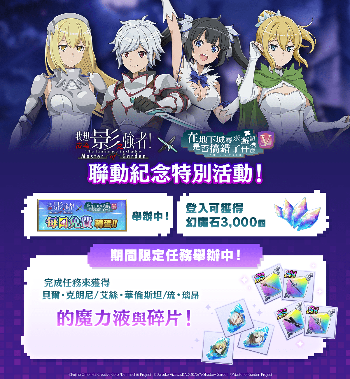为纪念‘在地下城出现影之强者是否搞错了什么’合作活动举行,于游戏内实施一系列活动,包括期间内每日免费抽、期间内首次登入游戏可获得 3000 幻魔石、实施期间限定任务&培育任务。