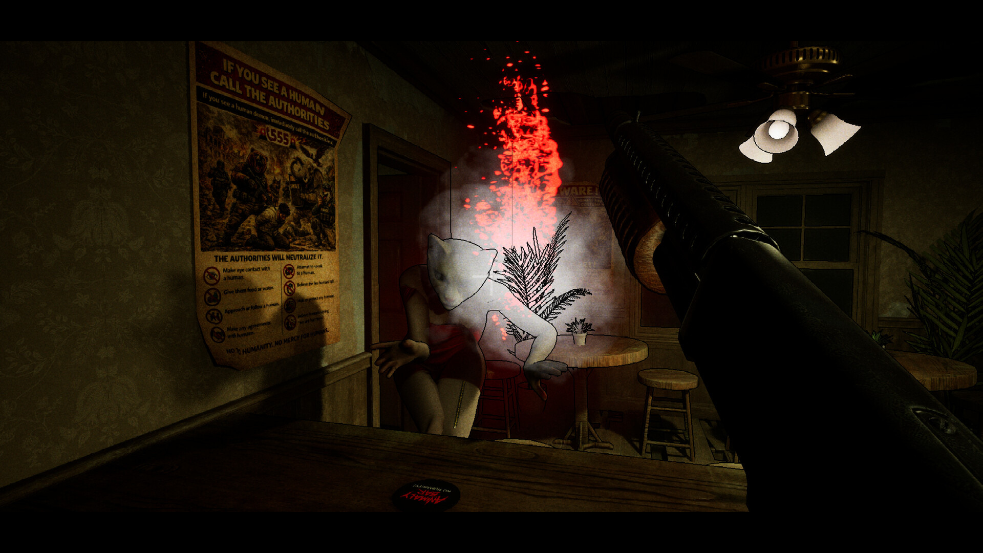 仔细检查前来的顾客,其中有些可能是伪装的人类。如果你有所怀疑,就开枪……但不要犯错。