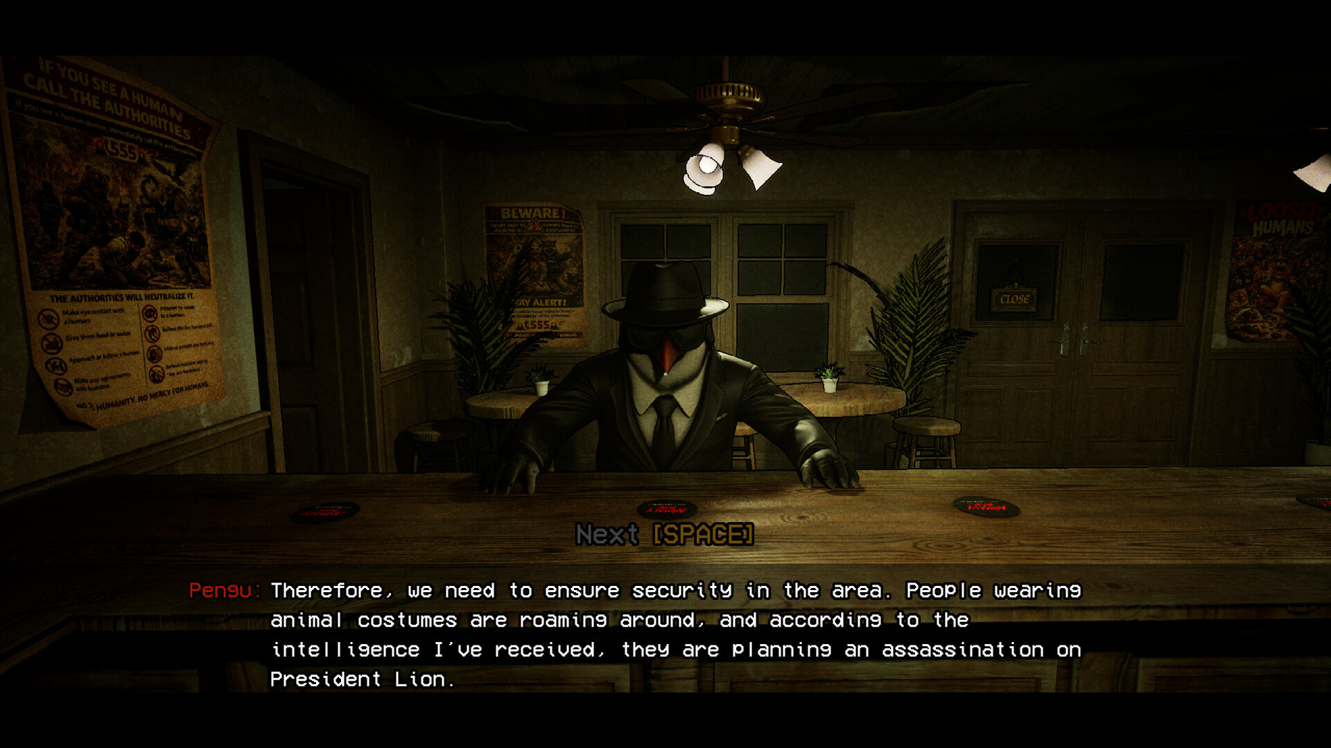 本作描述在动物赢得了对人类的战争之后,世界如今已由动物掌控。玩家将化身为 “兽人酒吧”的一名大猩猩调酒师边调制饮品,边仔细观察顾客,并分析他们的行为,因为其中可能混有伪装的人类。识别嫌疑者,等待正确的时机并将其消灭。但请小心……选择错误的目标或让过多的人类逃脱,可能会带来严重的后果。