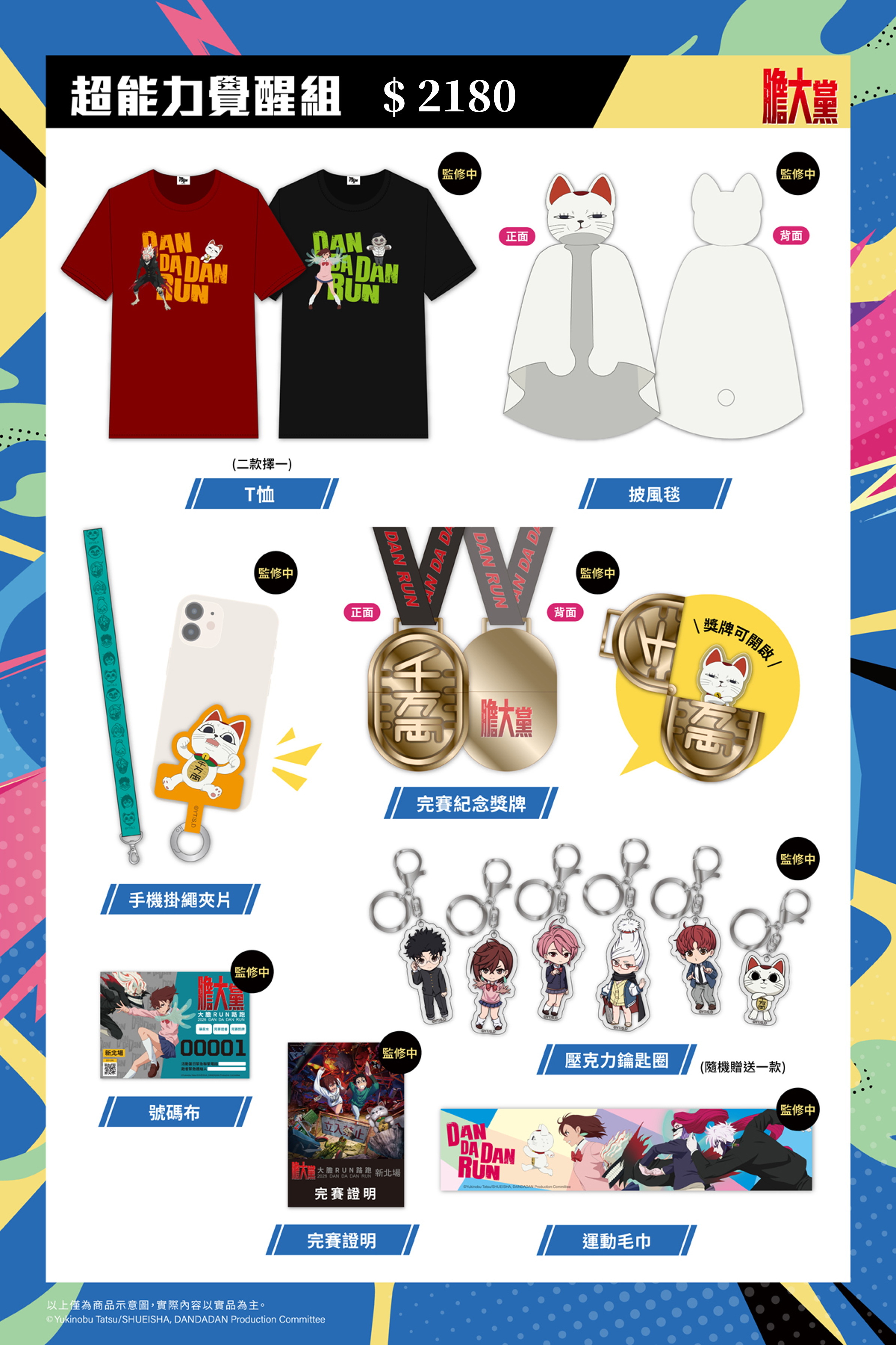 超能力觉醒组(售价2180元):手机挂绳夹片、披风毯、压克力钥匙圈、T恤、号码布、运动毛巾、完赛纪念奖牌、完赛证明