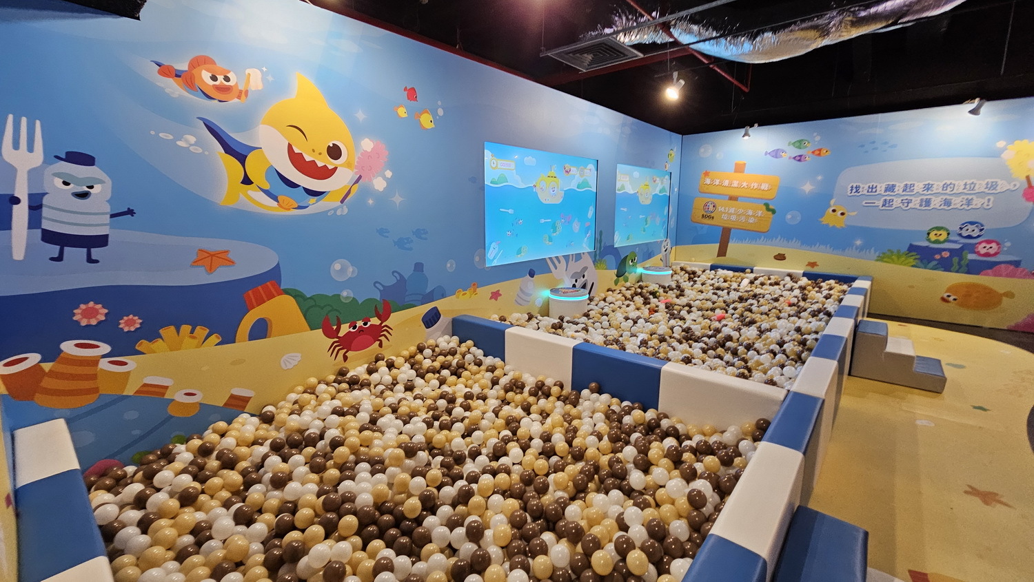 沉浸式情境与互动设计呈现海洋污染问题设计成大型球池,球池中放满垃圾教具和生物教具,透过教具让孩子透过体验理解塑胶垃圾、误食与生态破坏等议题。透过玩球池与‘行为参与’,从感受出发建立环境危机意识,进一步引导孩子思考日常生活与海洋保护的关联,培养初步的永续观念。