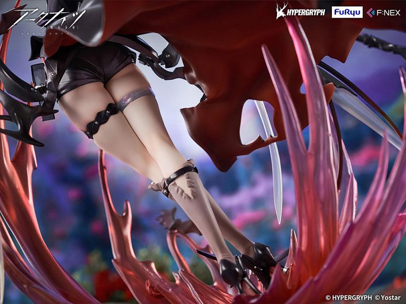本商品出自游戏《明日方舟》,将干员“隐德来希”以菁英二的造型立体化。由 Furyu 旗下高品质品牌 F:NEX 推出的 1/7 比例涂装完成品模型,再现了角色挥舞巨大镰刀的战斗姿态。商品包含本体及原创设计台座,台座以蝙蝠与玫瑰为主题,营造暗黑妖艳氛围。礼服细节采用珍珠与全像涂装,吊带环使用透明零件呈现水晶般质感。本品比例为 1/7,全高约 280mm(含台座)。敬请留意相关购买注意事项。