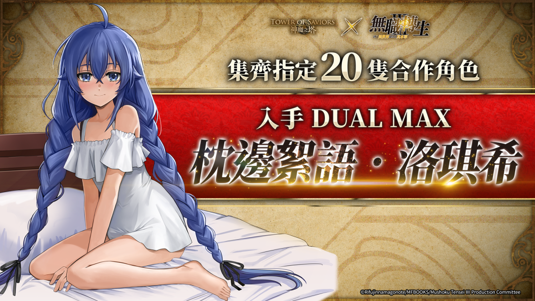 召唤师若能集齐 20 只《 无职转生 ~到了异世界就拿出真本事~》合作角色,将可入手 DUAL MAX“枕边絮语 ‧ 洛琪希”1 只。