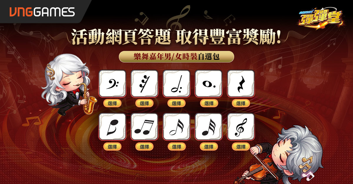 活动共开放 10 题,采依活动日期逐步解锁机制,每答对一题即可获得补给奖励与音符代币;累积音符代币可兑换“乐舞嘉年”男女时装自选箱限定外观道具及其他多样虚宝。若答题失败,则可于隔日再次挑战,并支援补答,让晚加入的玩家亦能完整参与;活动亦设有 Facebook 分享任务,完成指定操作即可获得“馀音绕梁”翅膀乙个。