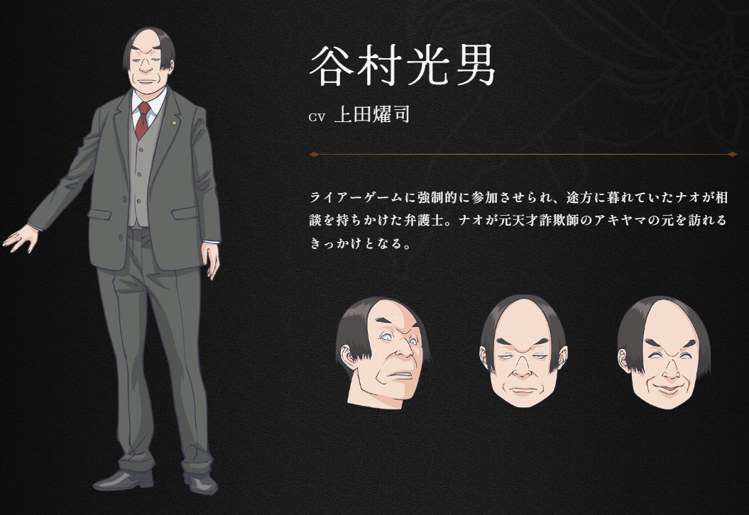 标注 LIAR GAME 事务所的寄件者告诉她,包裹中装有总计一亿元的日币,神崎必须作为 1 对 1 其中一方玩家想办法骗取另一方手上的资金,若是不幸落败就会背负巨额的债务。让她感觉幸运的是这次的对手是中学时期的老师,于是满怀信任找昔日恩师商量,但最后的结果自然是毫不留情的背叛,走投无路之下,经由律师事务所推荐,神崎不得不向传说中的诈欺师秋山深一(CV:大冢刚央)求助…